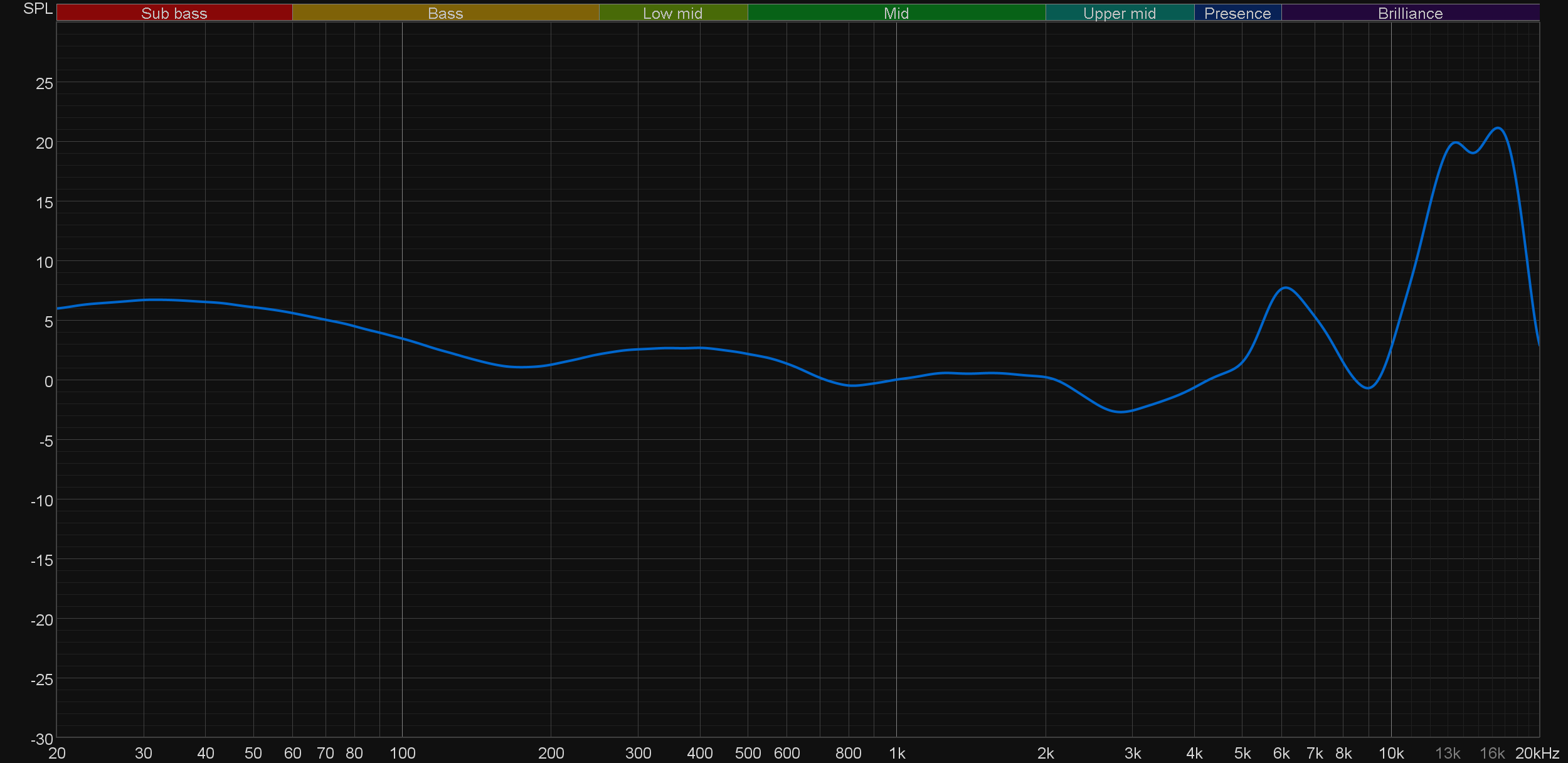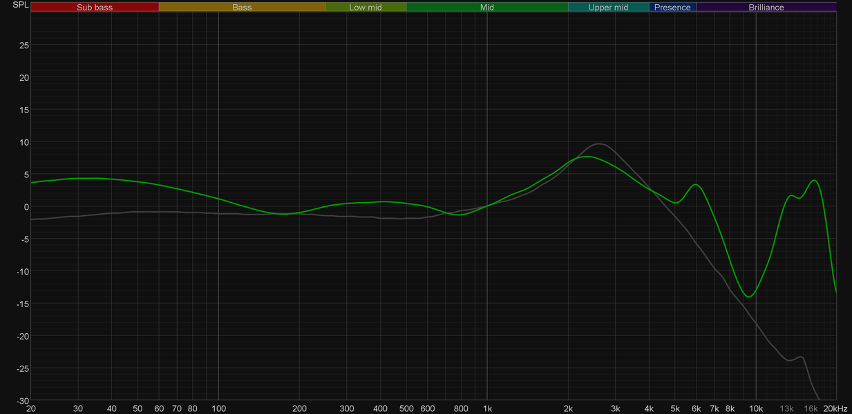 График выше показан на фоне кривой IDF (IEM diffuse field compensation), предоставленной производителем используемого стенда. Ее задача — помочь скомпенсировать резонансные явления в имитированном слуховом канале и особенности оборудования, создав «звуковой профиль», максимально корректно иллюстрирующий то, как звучание наушников воспринимается слушателем. Ее можно рассматривать как адаптированный под конкретное устройство аналог так называемой «кривой Хармана», созданной командой Harman International под руководством доктора Шона Олива. Скомпенсируем полученный график АЧХ в соответствии с кривой IDF.