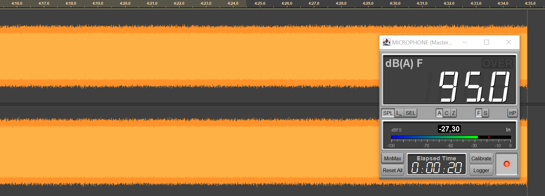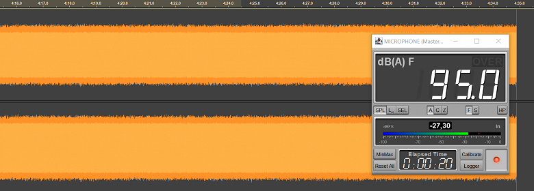 Безопасным уровнем звукового давления при прослушивании музыки считается 75 дБ, но на практике большинство слушателей предпочитает уровень 90-100 дБ. Мы транслируем в наушники белый шум, фиксируя уровень SPL в районе 95 дБ, сразу после старта воспроизведения запускаем запись сигнала с измерительного стенда — по длине получившегося трека легко понять, сколько проработал каждый из наушников.