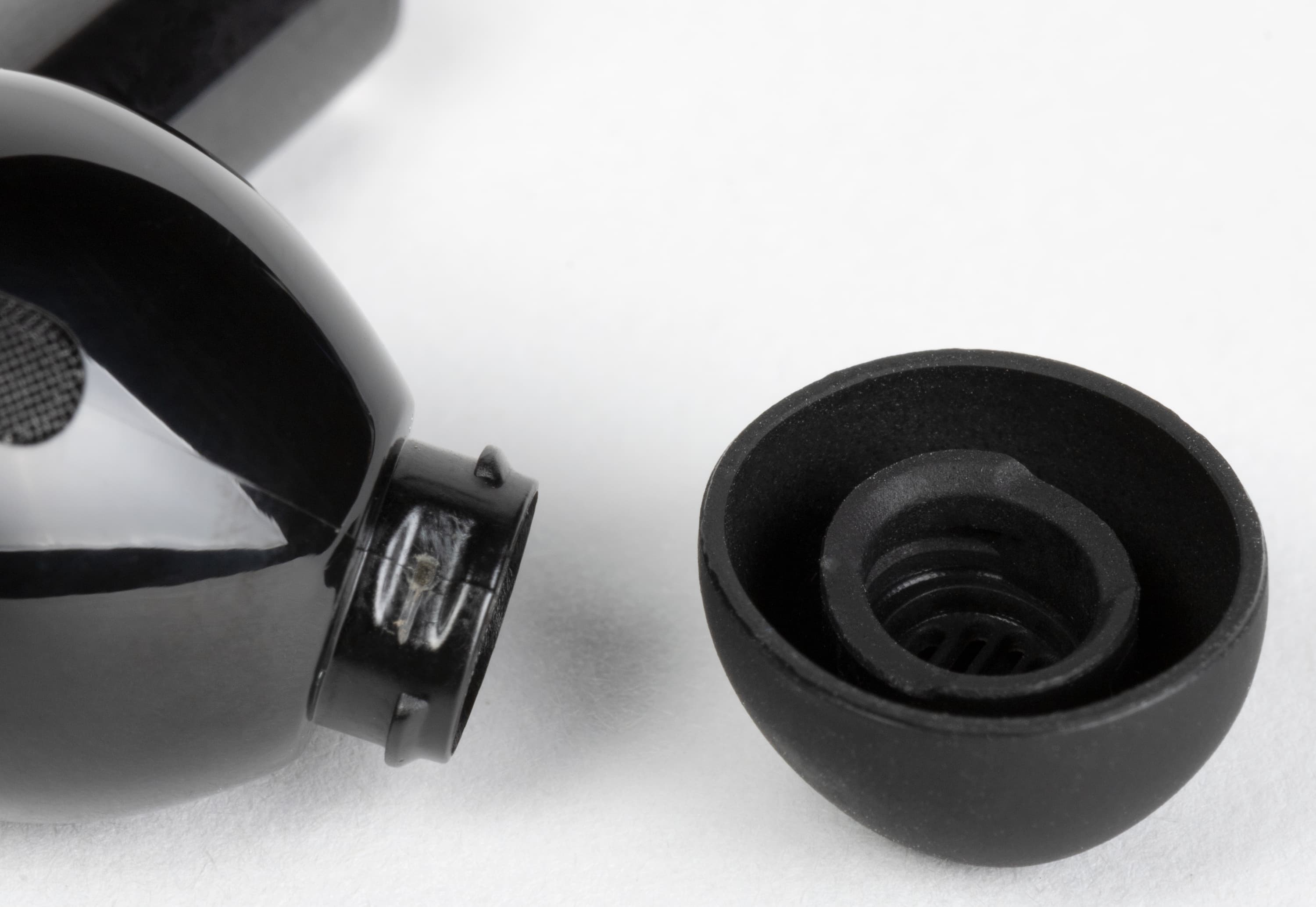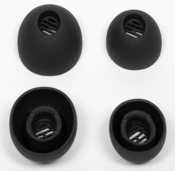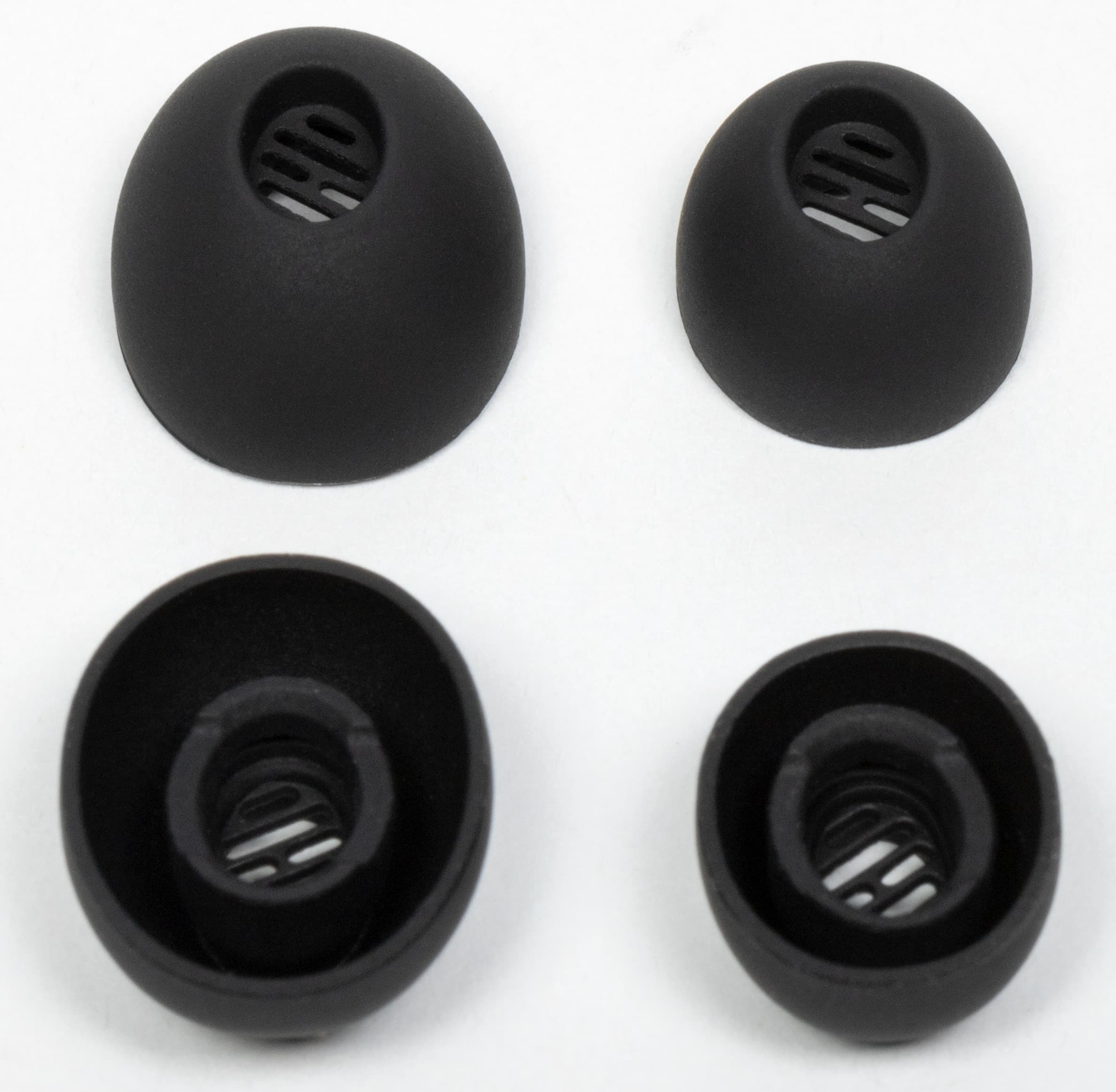 Силиконовые насадки приятны на ощупь и оснащены собственными «сеточками», препятствующими попаданию загрязнений на звуковод. В комплекте идет две дополнительные пары — маленькая и большая, среднего же размера установлена по умолчанию.