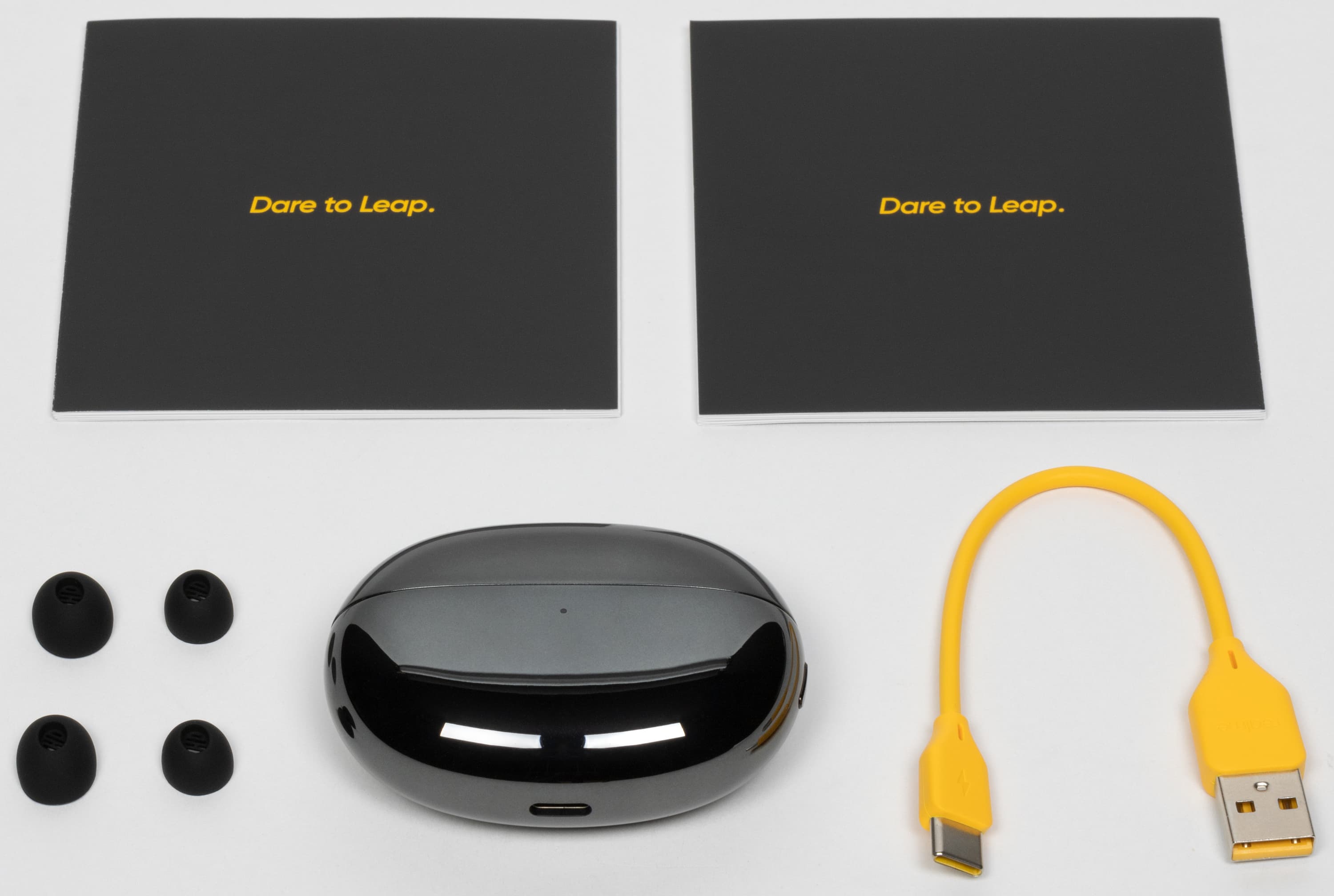 В комплект поставки входят наушники в кейсе для зарядки и переноски, документация, запасные силиконовые насадки и кабель USB-C — USB-A.