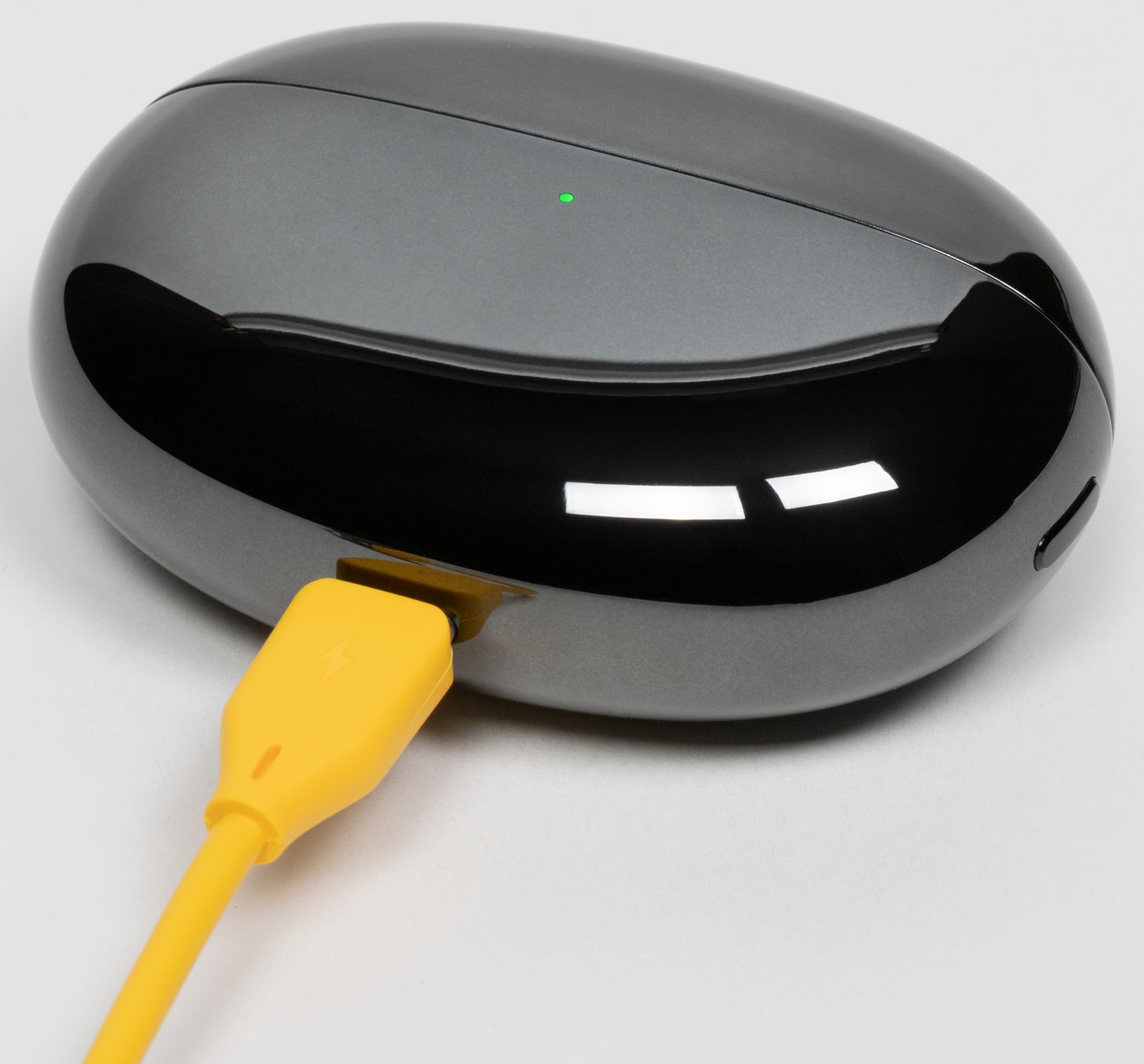 По центру передней панели кейса находится маленький светодиодный индикатор состояния и зарядки. Во время сопряжения он мигает белым, при необходимости поставить устройство на зарядку — горит красным. В остальных случаях используется зеленое свечение.