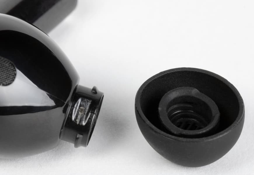 Силиконовые насадки удерживаются небольшими выступами на конце звуковода. Снимаются и надеваются обратно они легко и без лишних проблем.