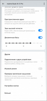В общем, звучит Realme Buds Air 5 Pro действительно замечательно для полностью беспроводной гарнитуры, а обширные возможности настройки позволяют адаптировать звуковой профиль под запросы большинства слушателей — от убежденных бассхэдов до любителей акцентированного вокала.