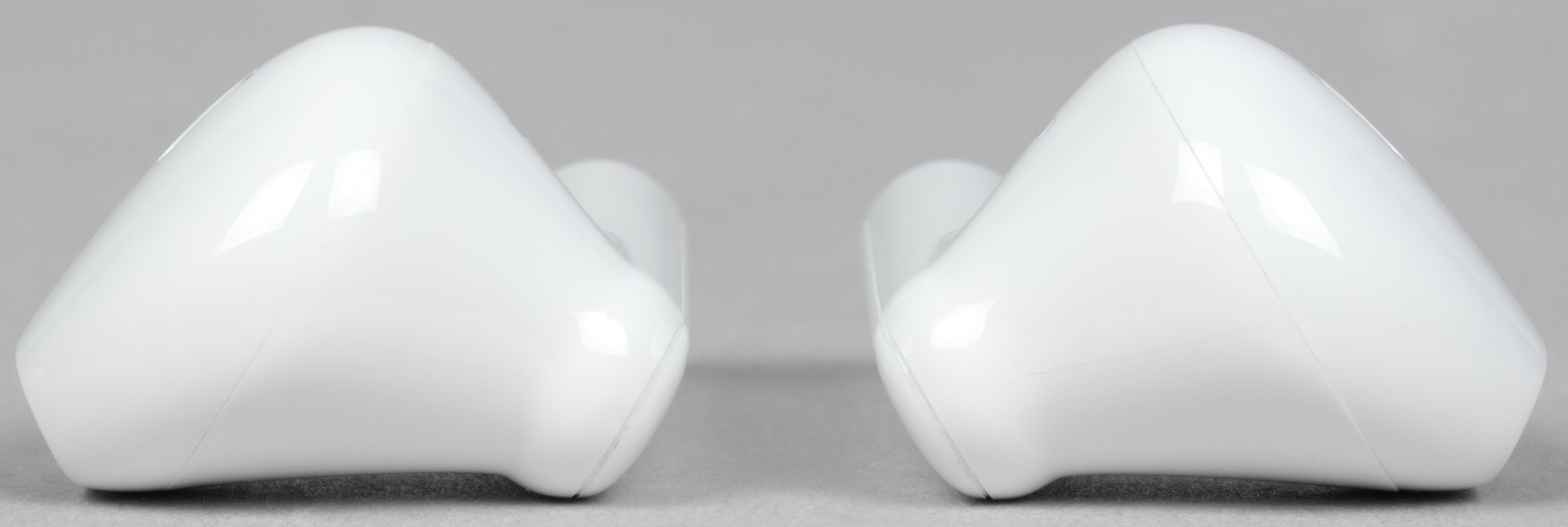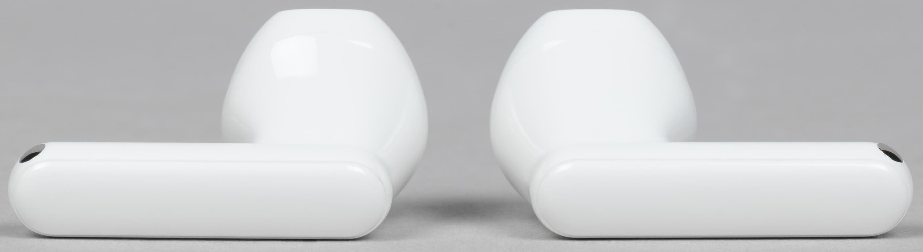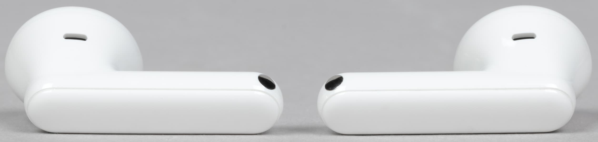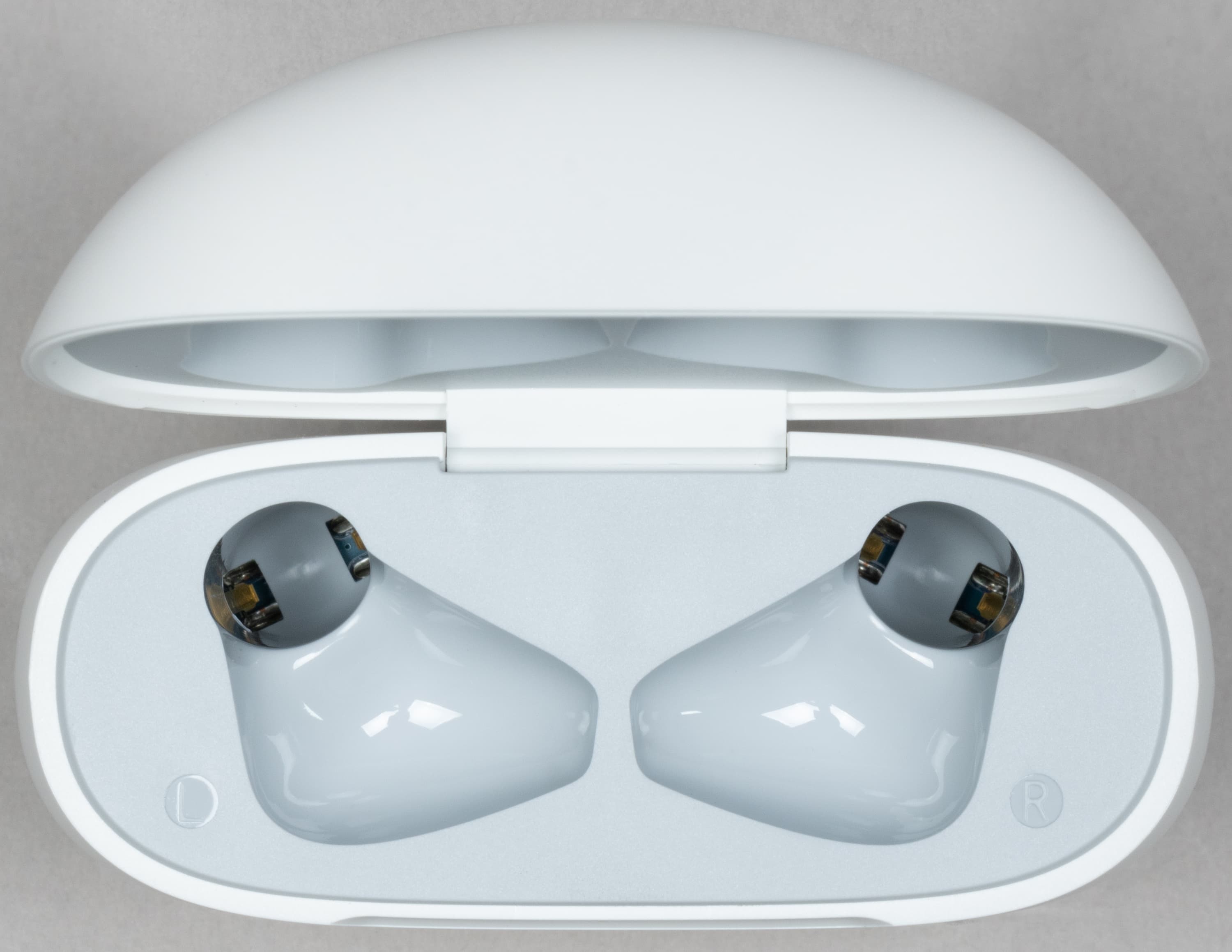 В слотах для наушников видны подпружиненные контакты для зарядки. По бокам находятся едва заметные обозначения «правый-левый».