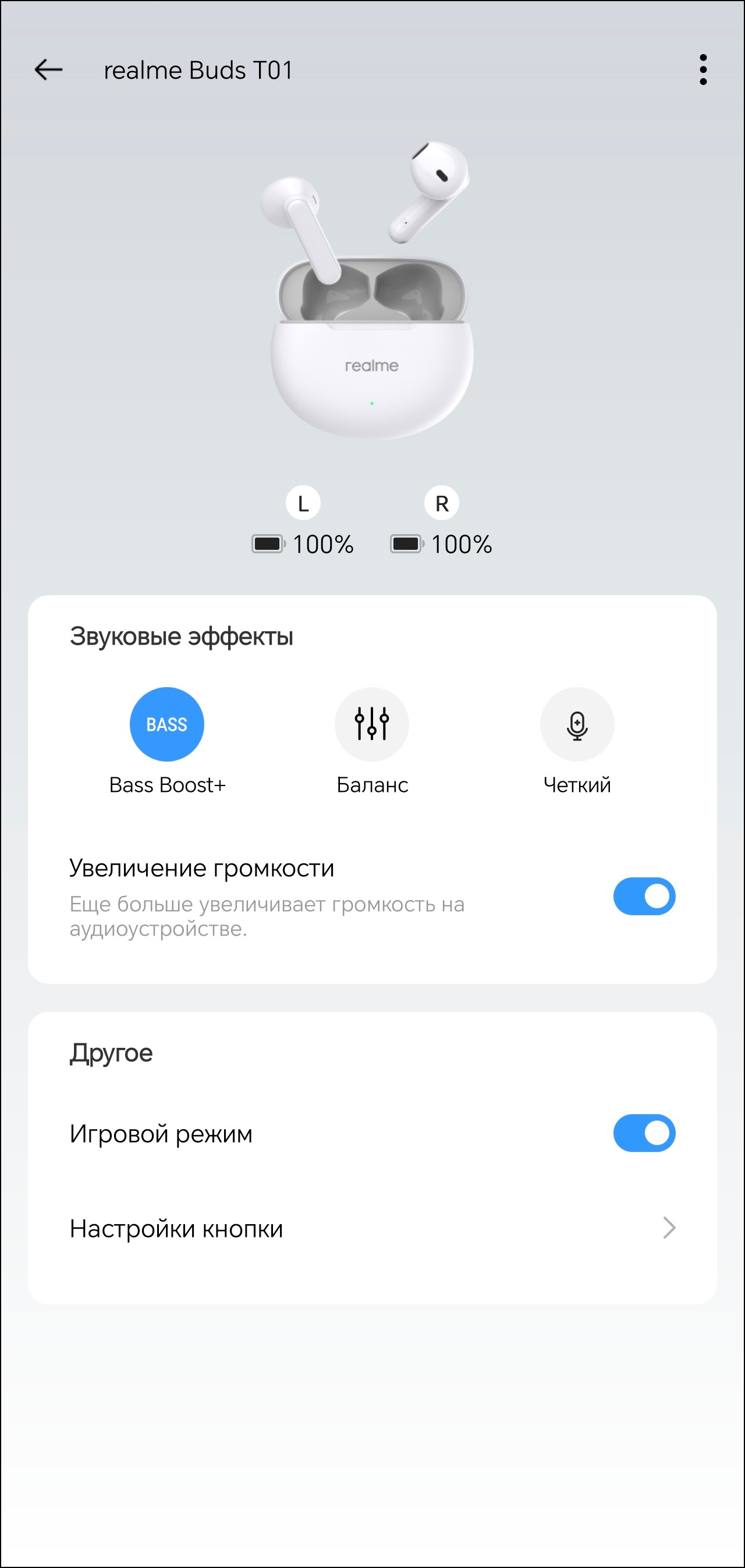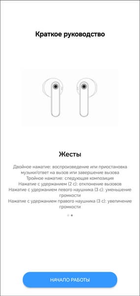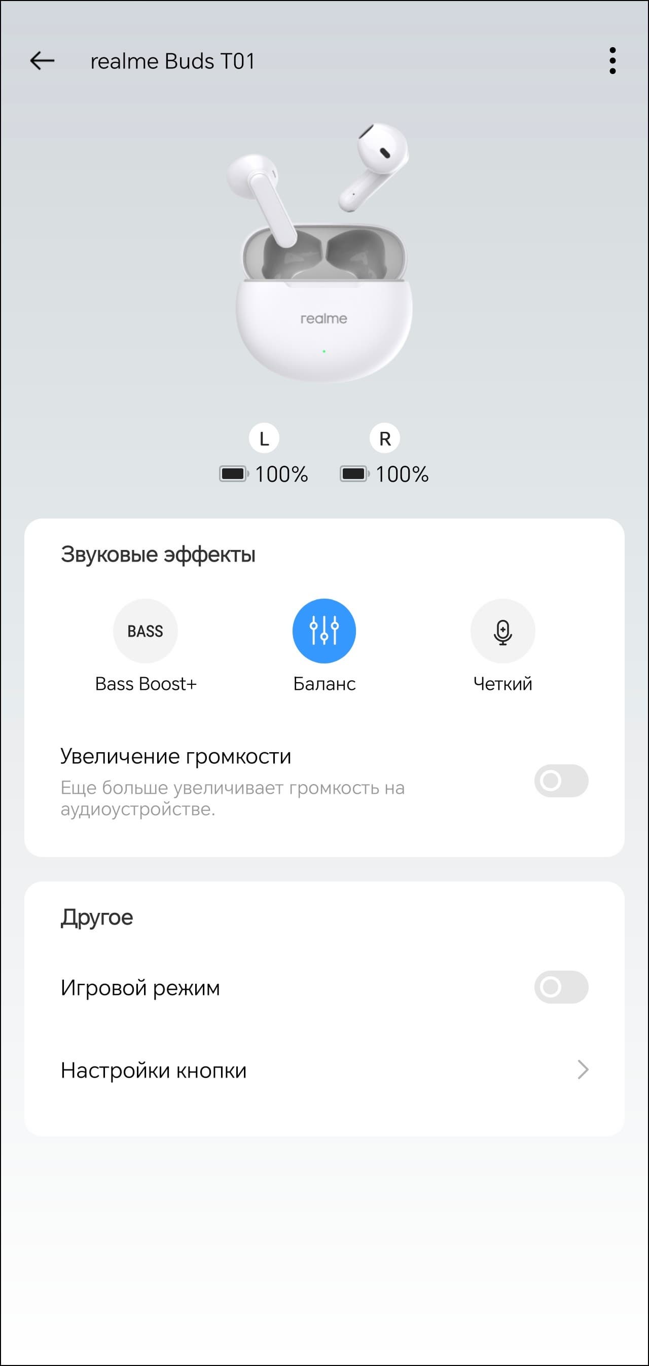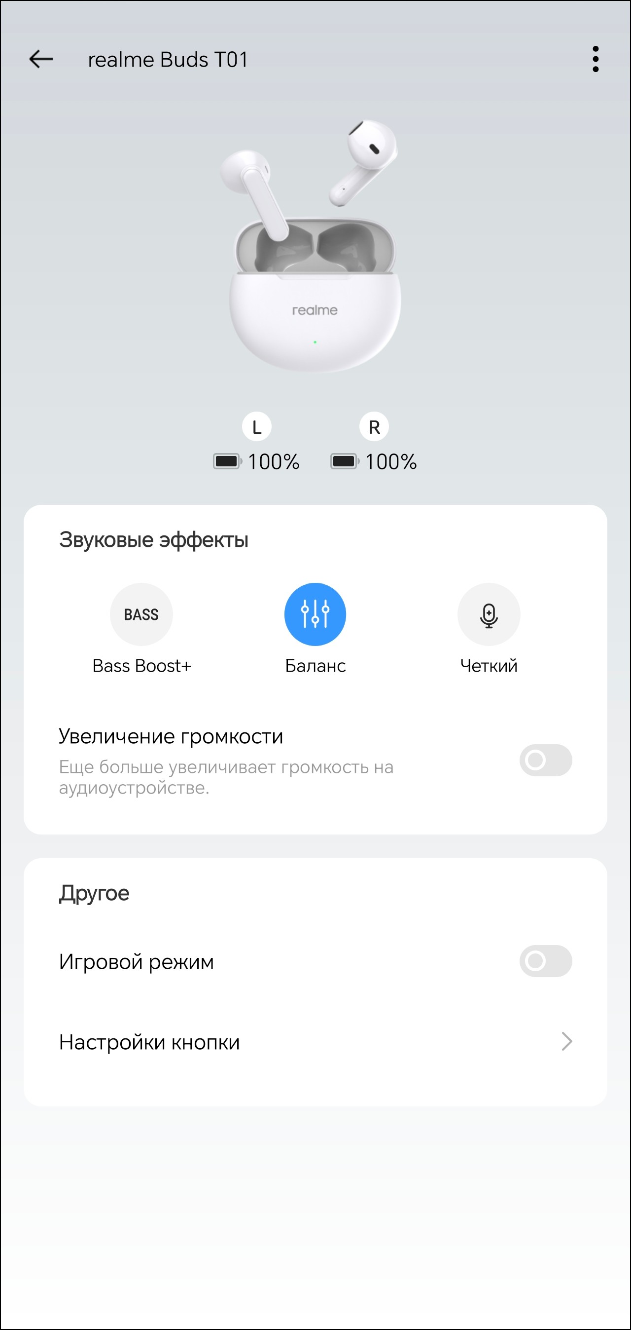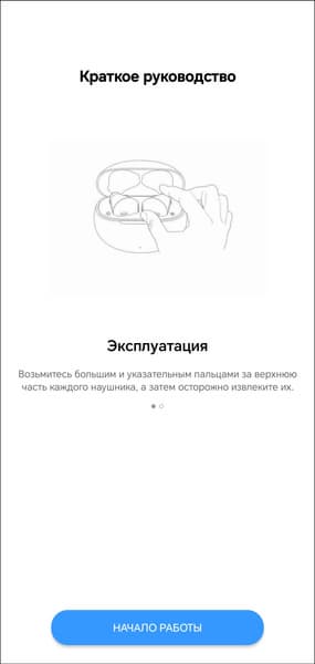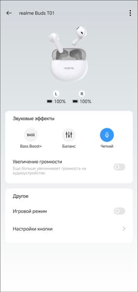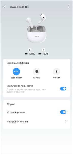 Настройка гарнитуры осуществляется через приложение Realme Link. После установки оно предлагает ознакомиться с краткой инструкцией, корректно переведенной на русский язык. В верхней части главного экрана можно увидеть уровень зарядки каждого из наушников. А вот о состоянии аккумулятора кейса придется судить, ориентируясь лишь на светодиодный индикатор на его передней панели. В модуле ниже можно выбрать один из трех профилей эквалайзера, про их работу мы еще поговорим.