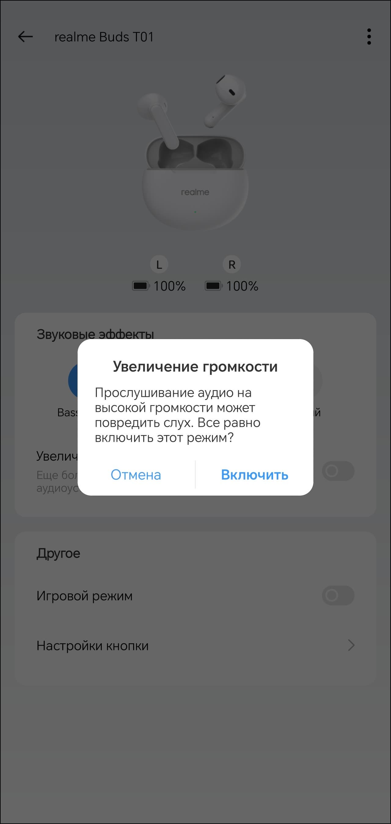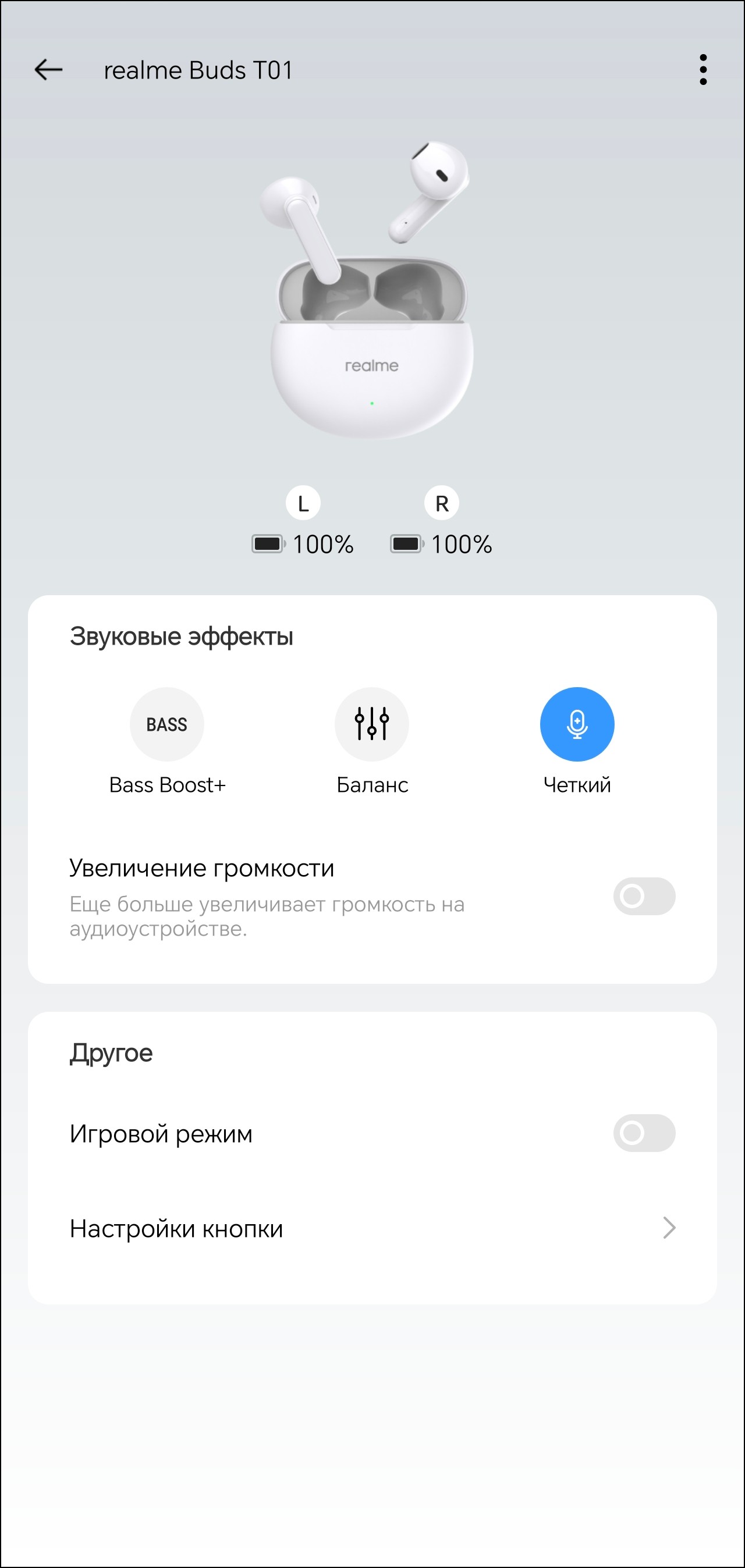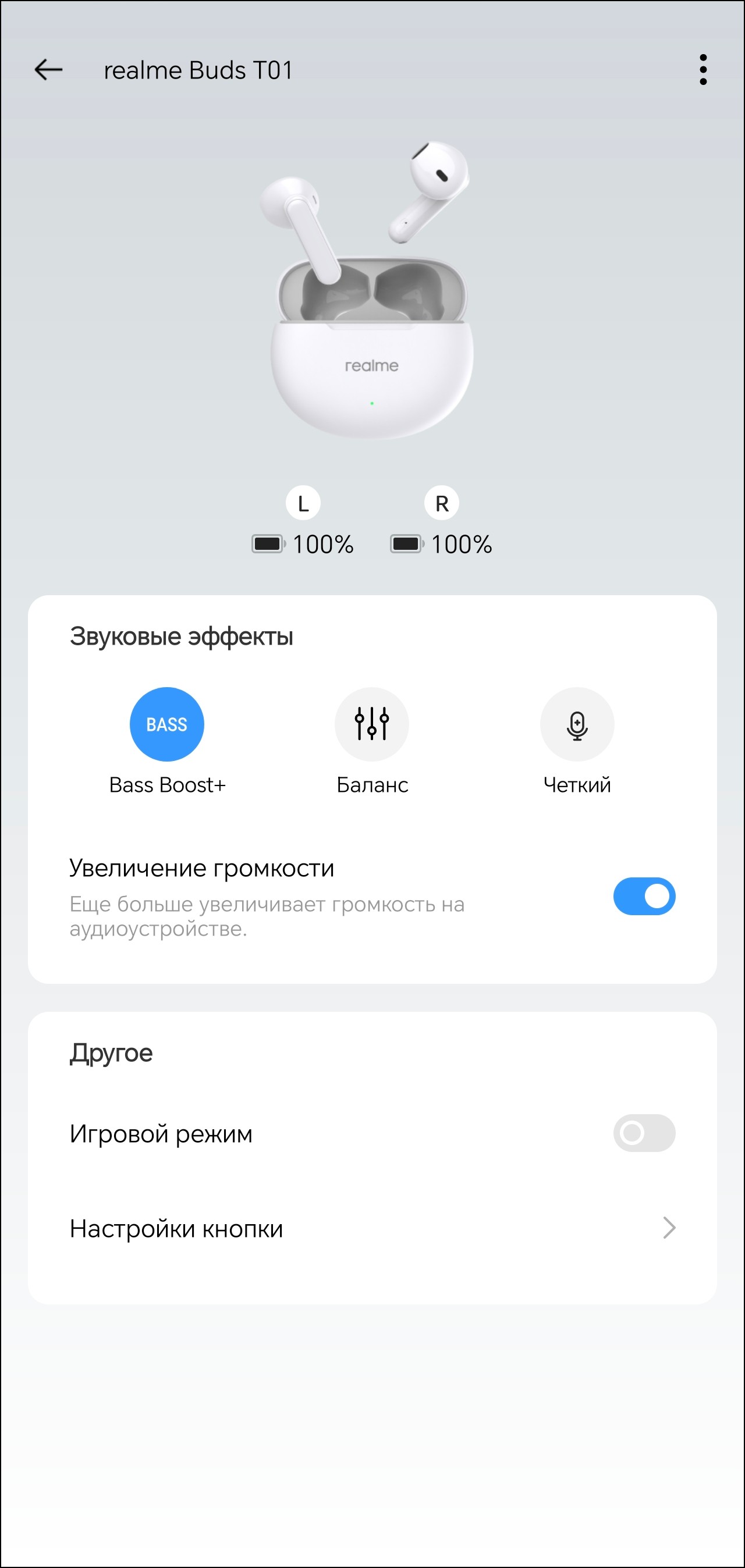 Настройка гарнитуры осуществляется через приложение Realme Link. После установки оно предлагает ознакомиться с краткой инструкцией, корректно переведенной на русский язык. В верхней части главного экрана можно увидеть уровень зарядки каждого из наушников. А вот о состоянии аккумулятора кейса придется судить, ориентируясь лишь на светодиодный индикатор на его передней панели. В модуле ниже можно выбрать один из трех профилей эквалайзера, про их работу мы еще поговорим.