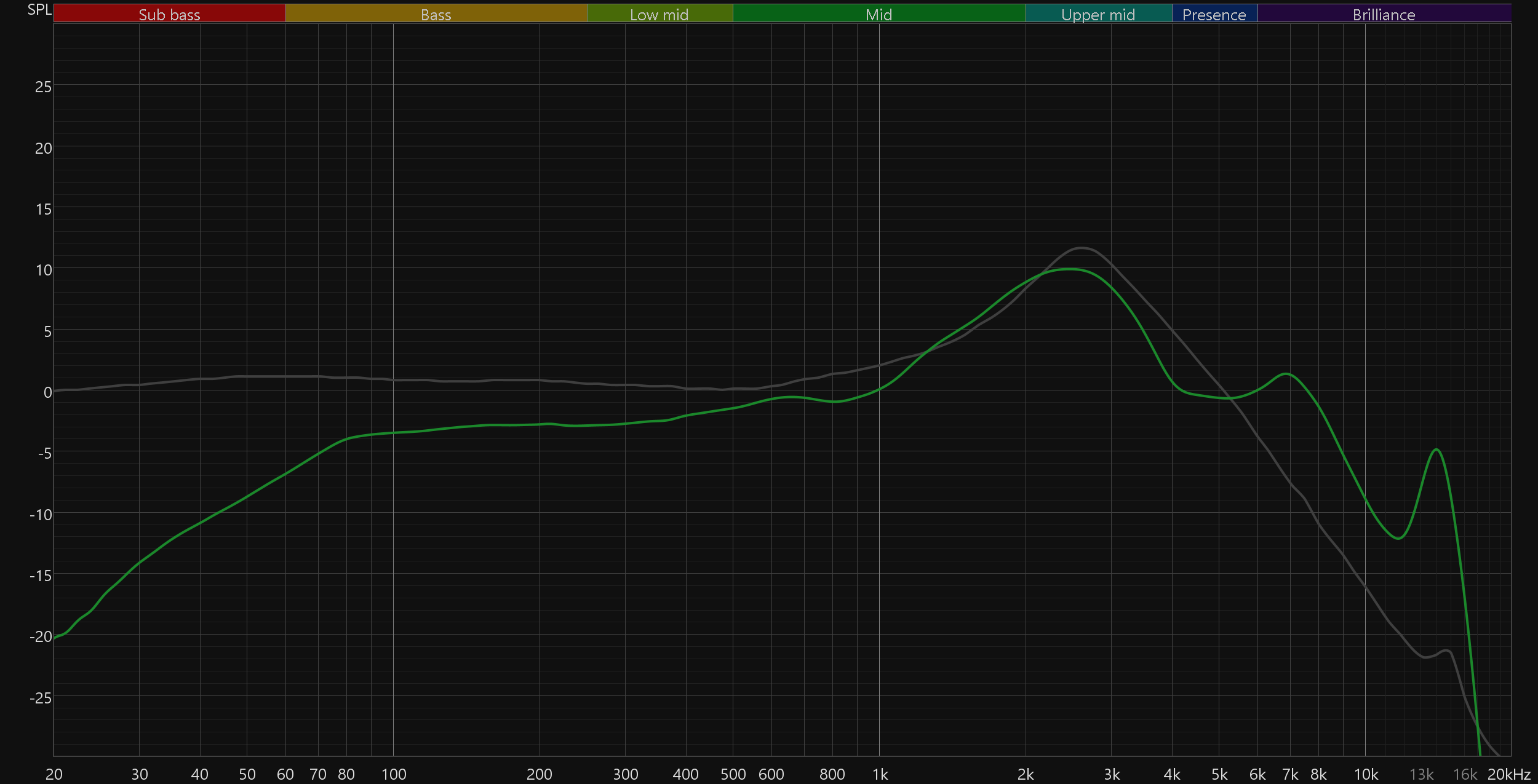 График выше показан на фоне кривой IDF (IEM diffuse field compensation), предоставленной производителем используемого стенда. Ее задача — помочь скомпенсировать резонансные явления в имитированном слуховом канале и особенности оборудования, создав «звуковой профиль», максимально корректно иллюстрирующий то, как звучание наушников воспринимается слушателем. Ее можно рассматривать как адаптированный под конкретное устройство аналог так называемой «кривой Хармана», созданной командой Harman International под руководством доктора Шона Олива. Скомпенсируем полученный график АЧХ в соответствии с кривой IDF. В таком виде он наиболее полно иллюстрирует наши субъективные впечатления от прослушивания Realme Buds T01.