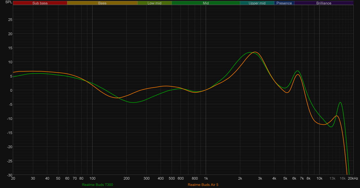 В Realme Buds T300 используется динамик с диаметром диафрагмы 12,4 мм, под который разработана специальная конструкция внутренней полости — всё как у Realme Buds Air 5. Соответственно, производитель снова обещает акцентированный НЧ-диапазон — в маркетинговых материалах про драйвер наушников говорят просто: «рожден для басов». Ну и обещание вновь выполнено — уж чего-чего, а низких частот у наушников предостаточно, что прекрасно видно на графике АЧХ.