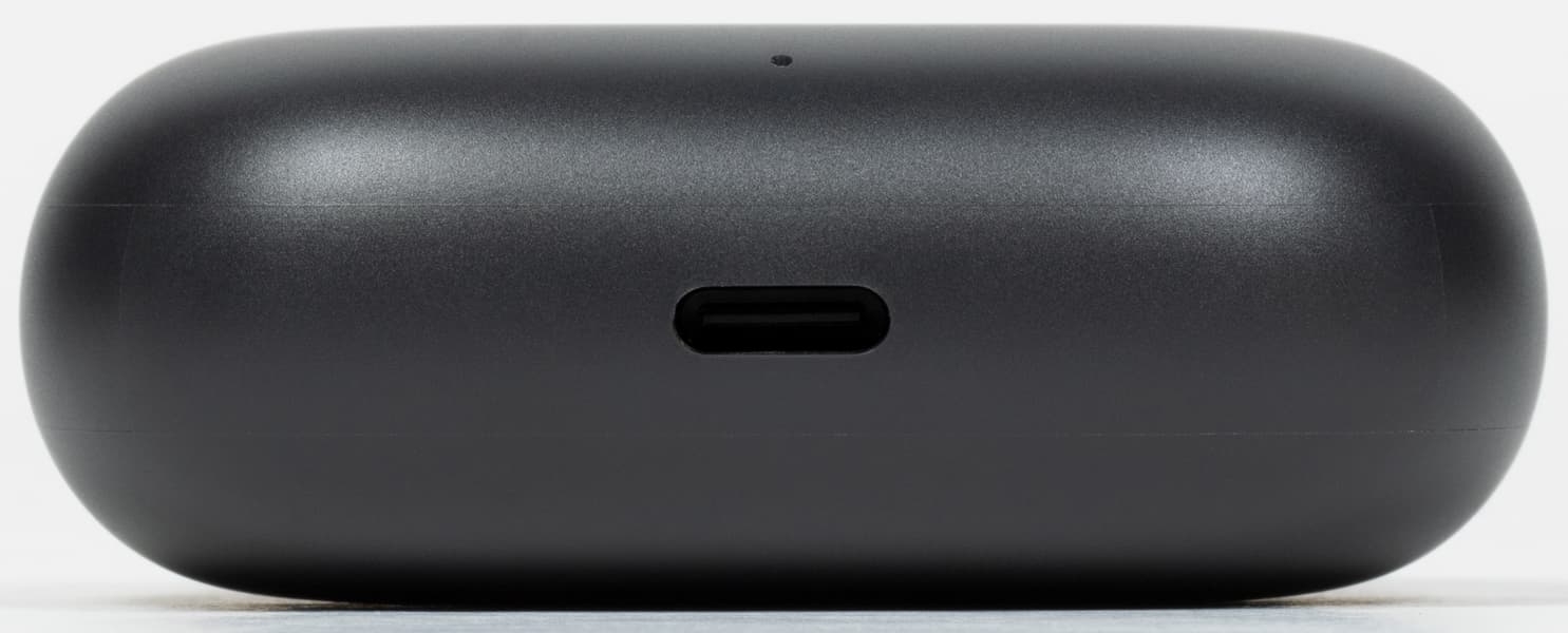 На дне футляра находится порт USB Type C для зарядки, а вот кнопки активации Bluetooth-сопряжения на этот раз нет — одновременное подключение к нескольким устройствам гарнитура не поддерживает.