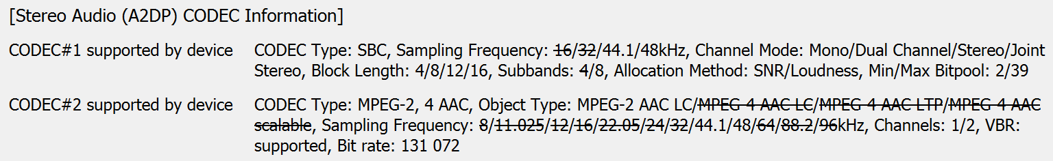 Полный список поддерживаемых кодеков и их режимов мы традиционно получили с помощью утилиты Bluetooth Tweaker. В данном случае их два — SBC и AAC.