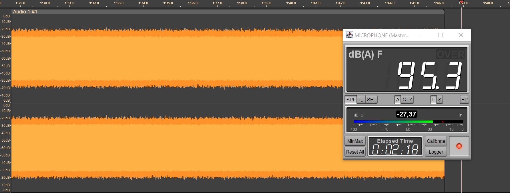 Безопасным уровнем звукового давления при прослушивании музыки считается 75 дБ, но на практике большинство слушателей предпочитает уровень 90-100 дБ. Мы транслируем в наушники белый шум, фиксируя уровень SPL в районе 95 дБ, сразу после старта воспроизведения запускаем запись сигнала с измерительного стенда — по длине получившегося трека легко понять, сколько проработал каждый из наушников.