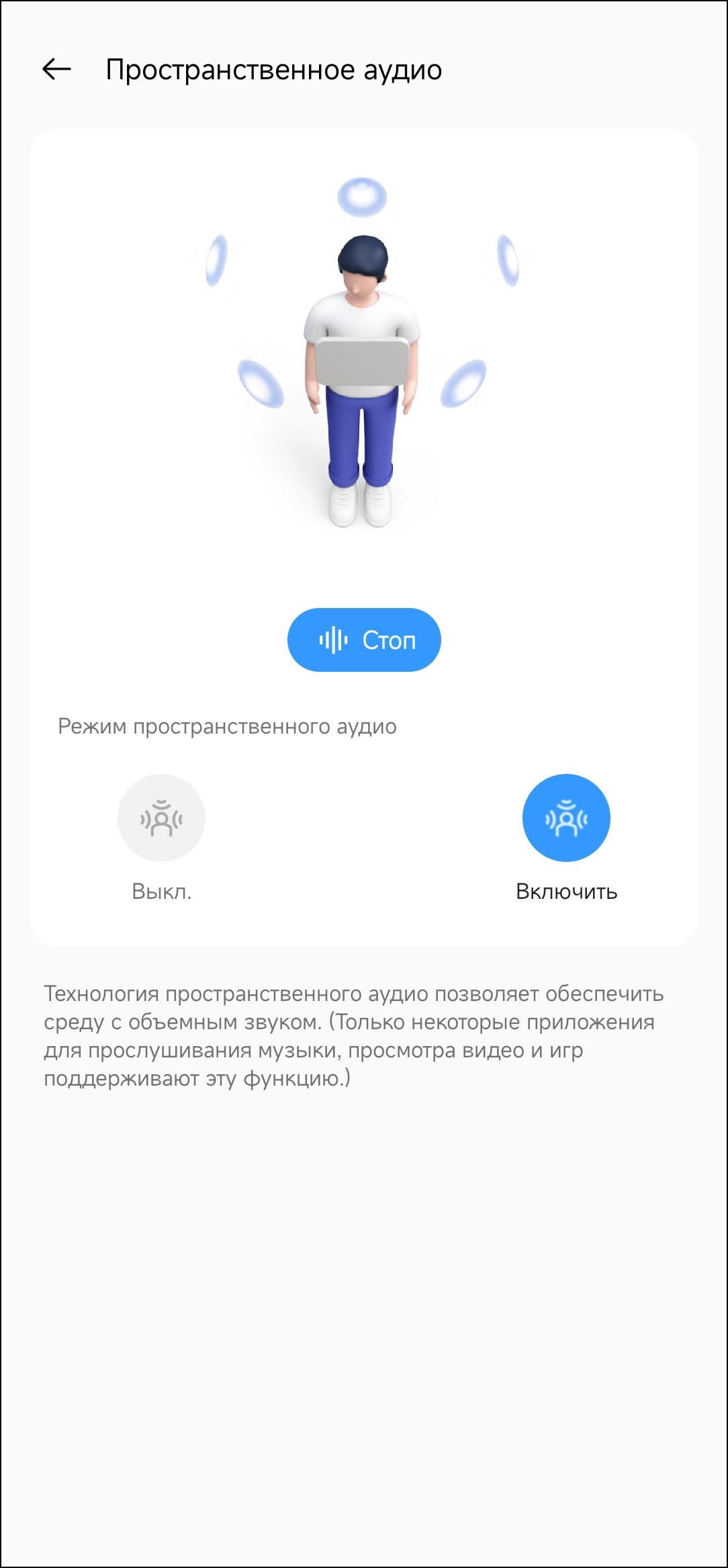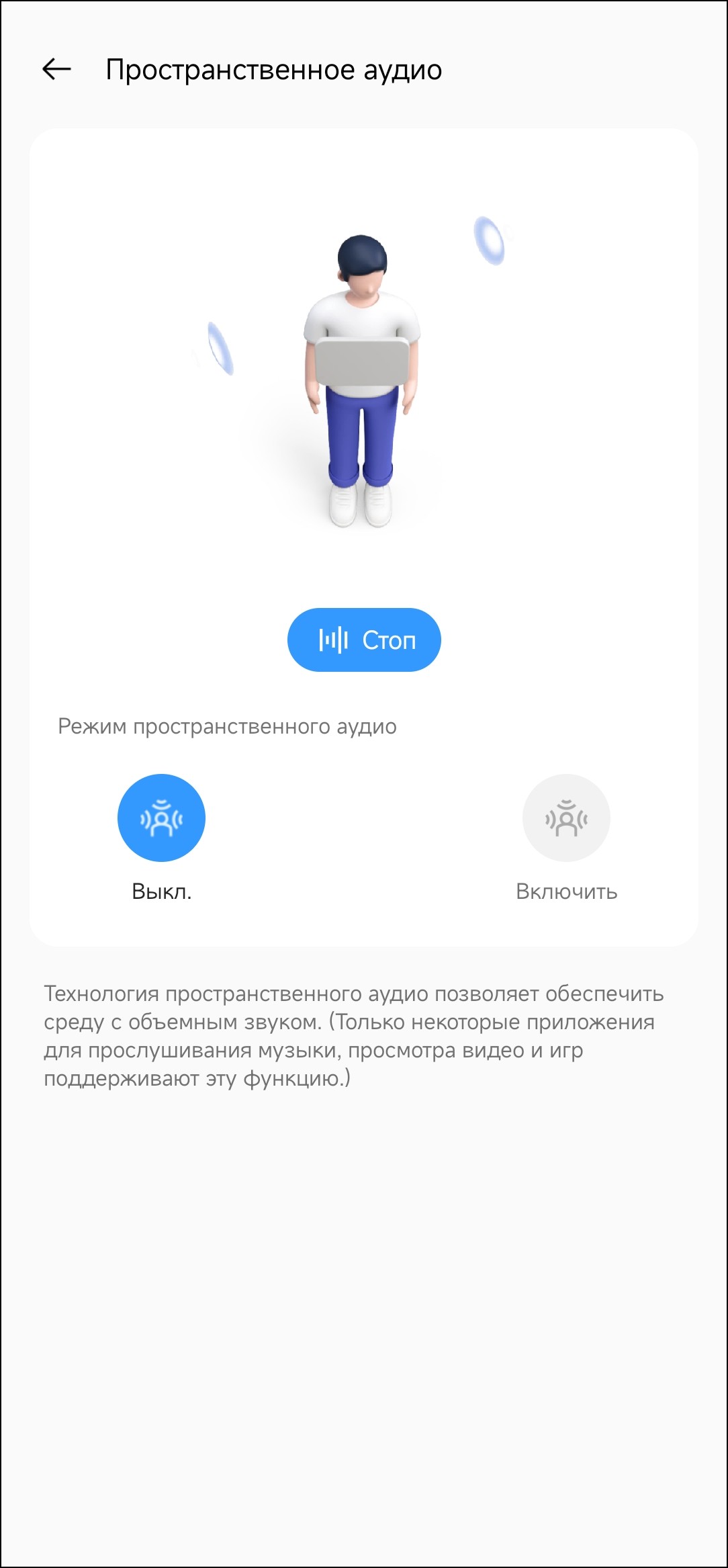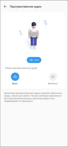 Функция «Пространственное аудио» позволяет добавить немного объема в звучание за счет задержек и реверберации — послушать, как это работает, можно прямо в приложении. На особый вау-эффект рассчитывать не стоит, но игрушка интересная.