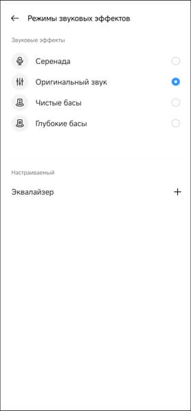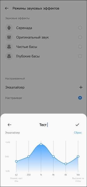 Активное шумоподавление можно включить и выключить — различных режимов его работы, как у Realme Buds Air 5, не предусмотрено. А вот эквалайзер полноценный — не хуже, чем у флагманов. С готовыми пресетами и возможностью создавать свои.