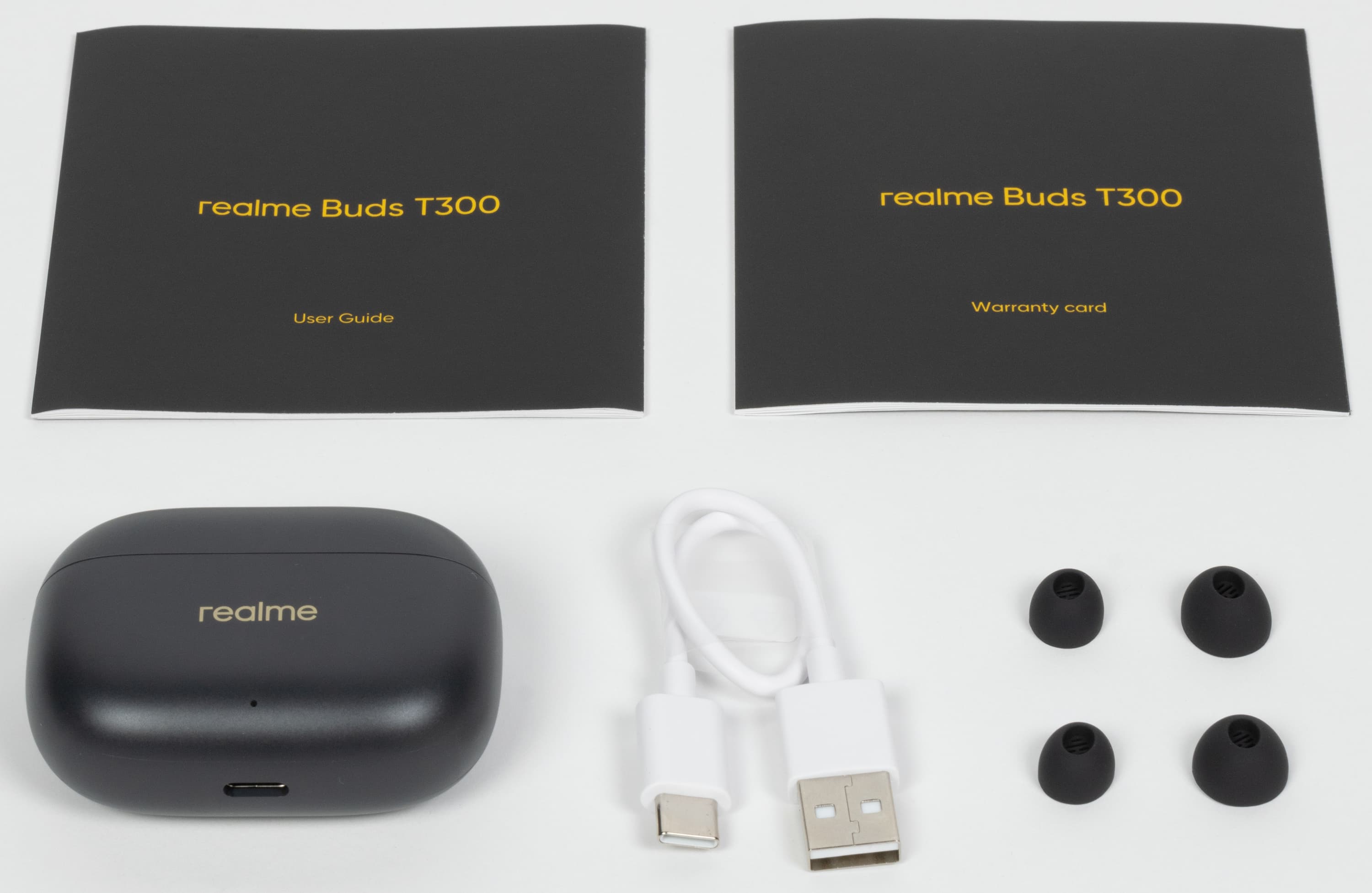 Комплект поставки тоже стандартный: наушники в кейсе, документация, запасные силиконовые насадки и кабель USB-C — USB-A.