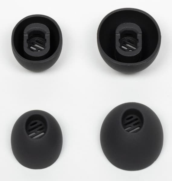 Насадки тоже не отличаются от тех, что мы видели у предыдущих двух моделей. Приятный силикон, собственные «сеточки», защищающие звуковод от загрязнений — всё на месте.