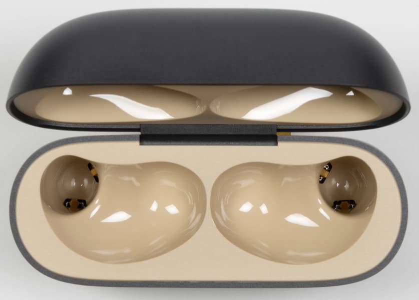 В своих слотах наушники надежно удерживаются магнитами, при этом вынуть их из кейса можно, просто слегка потянув на себя, а потом вверх.
