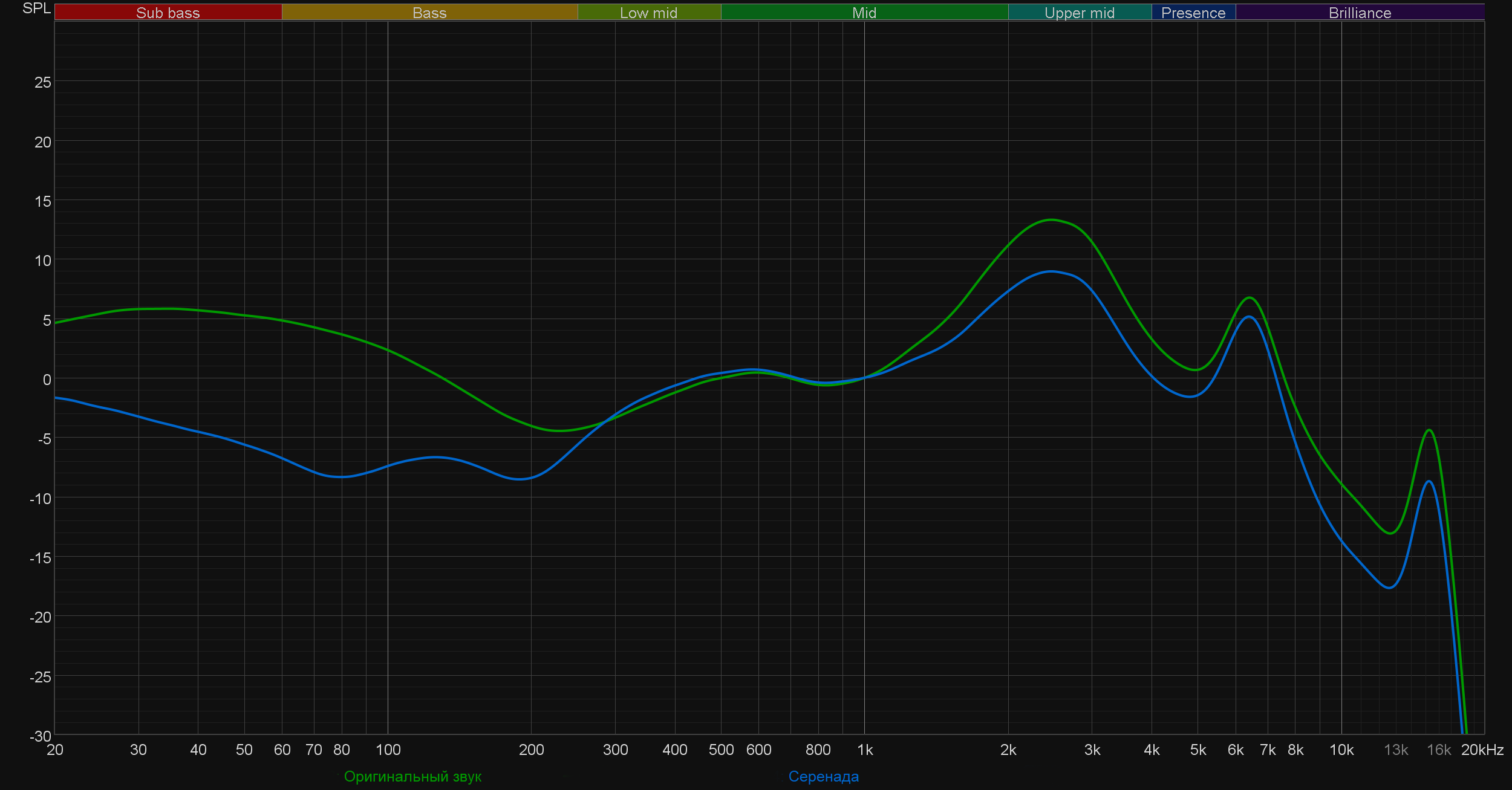 График выше показан на фоне кривой IDF (IEM diffuse field compensation), предоставленной производителем используемого стенда. Ее задача — помочь скомпенсировать резонансные явления в имитированном слуховом канале и особенности оборудования, создав «звуковой профиль», максимально корректно иллюстрирующий то, как звучание наушников воспринимается слушателем. Ее можно рассматривать как адаптированный под конкретное устройство аналог так называемой «кривой Хармана», созданной командой Harman International под руководством доктора Шона Олива. Скомпенсируем полученный график АЧХ в соответствии с кривой IDF.