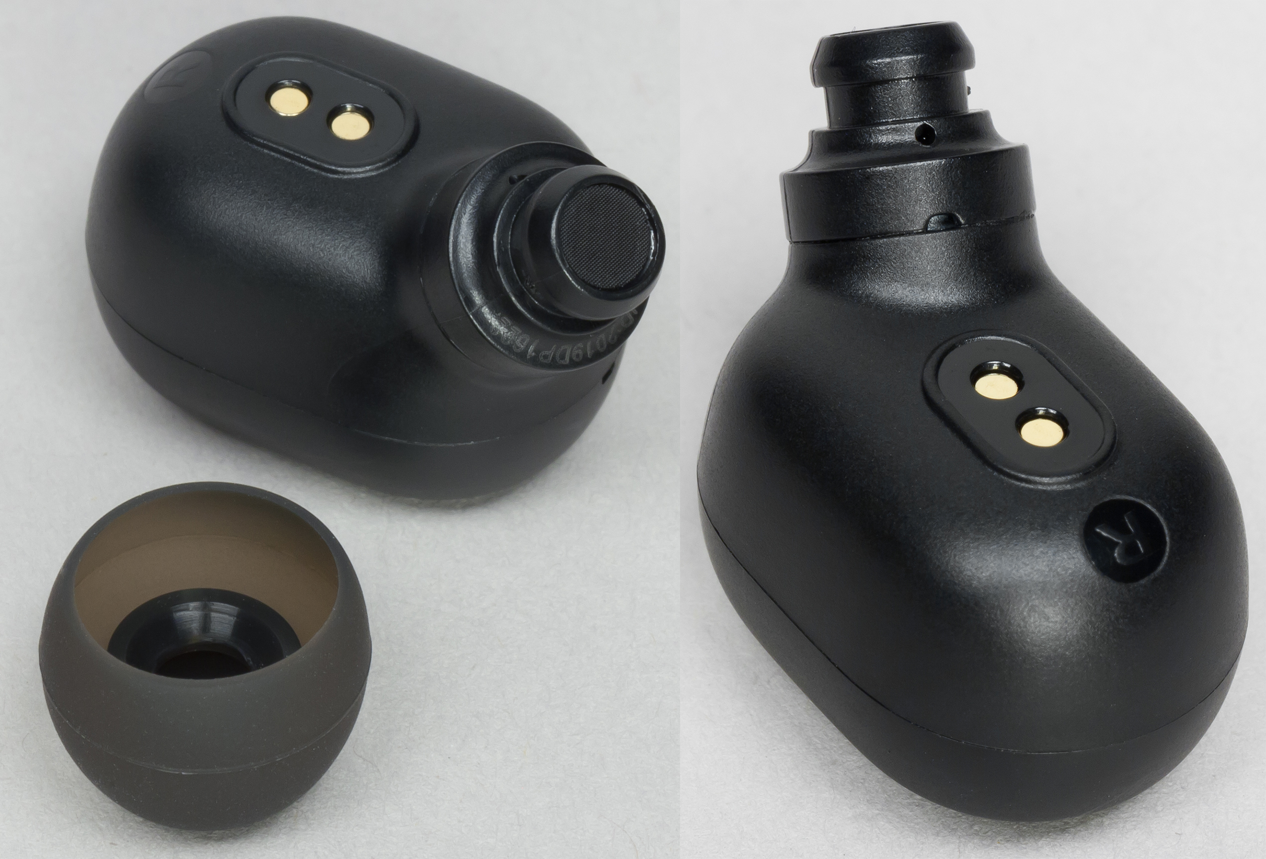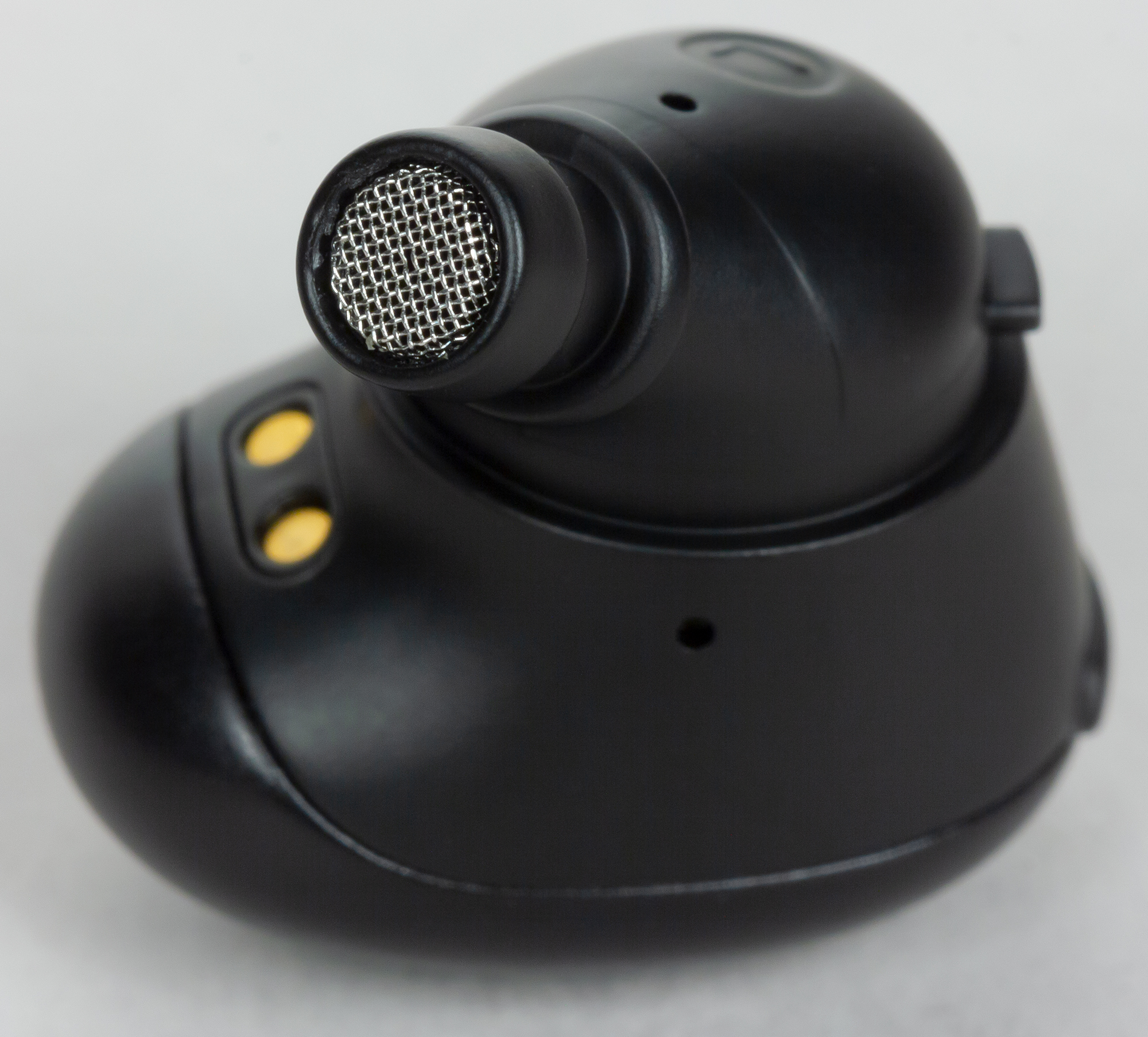 На нижней части корпуса находятся контакты для зарядки. Отверстие динамика защищено плотной сеткой. В торцах расположены небольшие метки «R» и «L», но заметить их достаточно сложно. Проще ориентироваться на положение наушников в кейсе и несимметричные части конструкции.