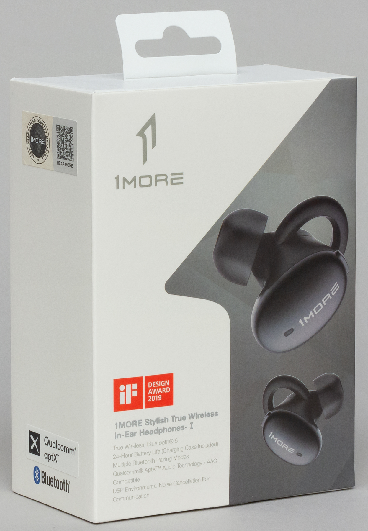 Упаковка 1More Stylish True Wireless выполнена на отличном уровне, который мы больше привыкли видеть у продуктов премиального сегмента. Коробка из плотного картона, качественная полиграфия, оригинальные дизайнерские решения — все при ней. Надписи на коробке здесь уже на английском.