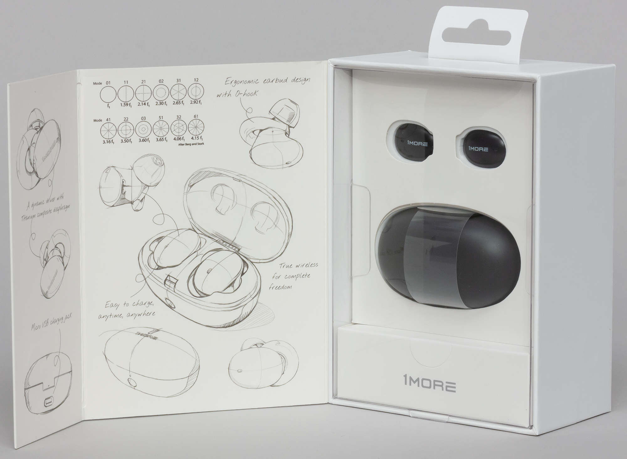 Откинув крышку коробки, видим на ее внутренней стороне иллюстрации, выполненные в стиле концепт-артов. Внутри коробки под прозрачной пластиковой крышкой на картонных ложементах расположены кейс для зарядки и сами наушники. Поверхности устройств дополнительно защищены пленкой. Под ложементом находится небольшая коробка с надписью 1More, в которую упакована часть дополнительной комплектации. В самой нижней части упаковки находится небольшая коробка с печатными материалами.
