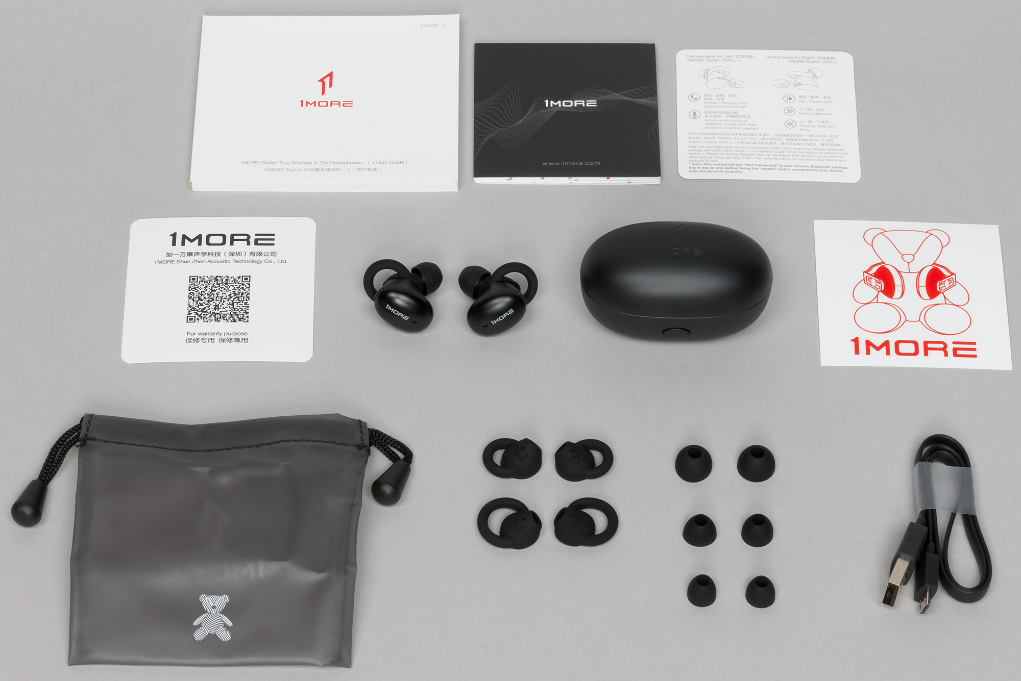 А вот комплект тут уже чуть-чуть побогаче. Сменных амбушюров три пары, добавился короткий кабель для зарядки.
