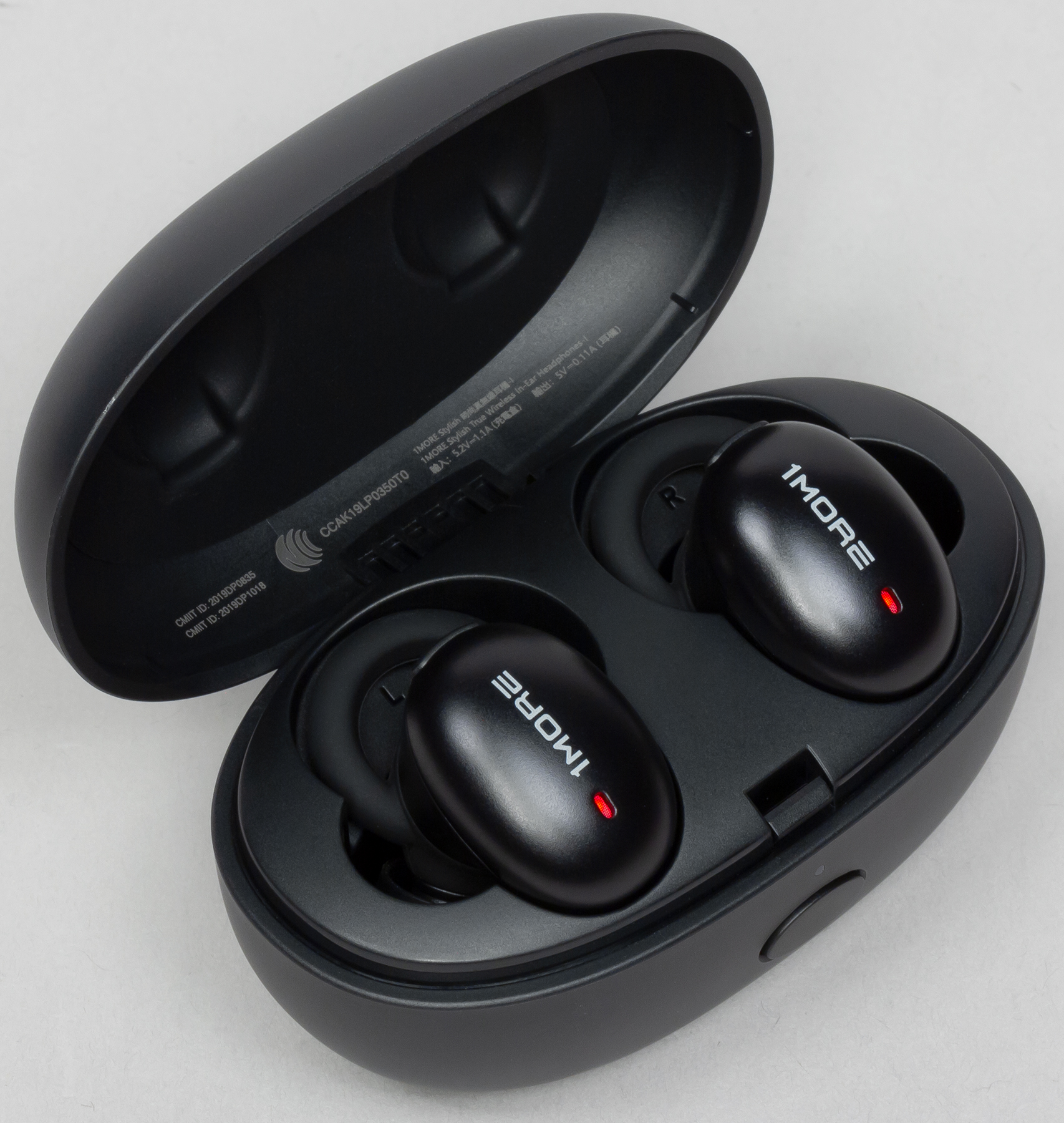 Ну и, наконец, 1More Stylish True Wireless. Самые дорогие наушники в сегодняшнем обзоре с претензией на «премиальный» сегмент. Но вот по кейсу этого, честно говоря, не скажешь. Пластик простенький, склонен к появлению царапин и отпечатков пальцев. Из-за достаточно крупных габаритов и яйцевидной формы его неудобно носить в кармане. Но есть у него и положительные черты: например — подпружиненная крышка без какого-либо люфта, открываемая с помощью кнопки на передней панели, где также можно заметить небольшой индикатор зарядки.