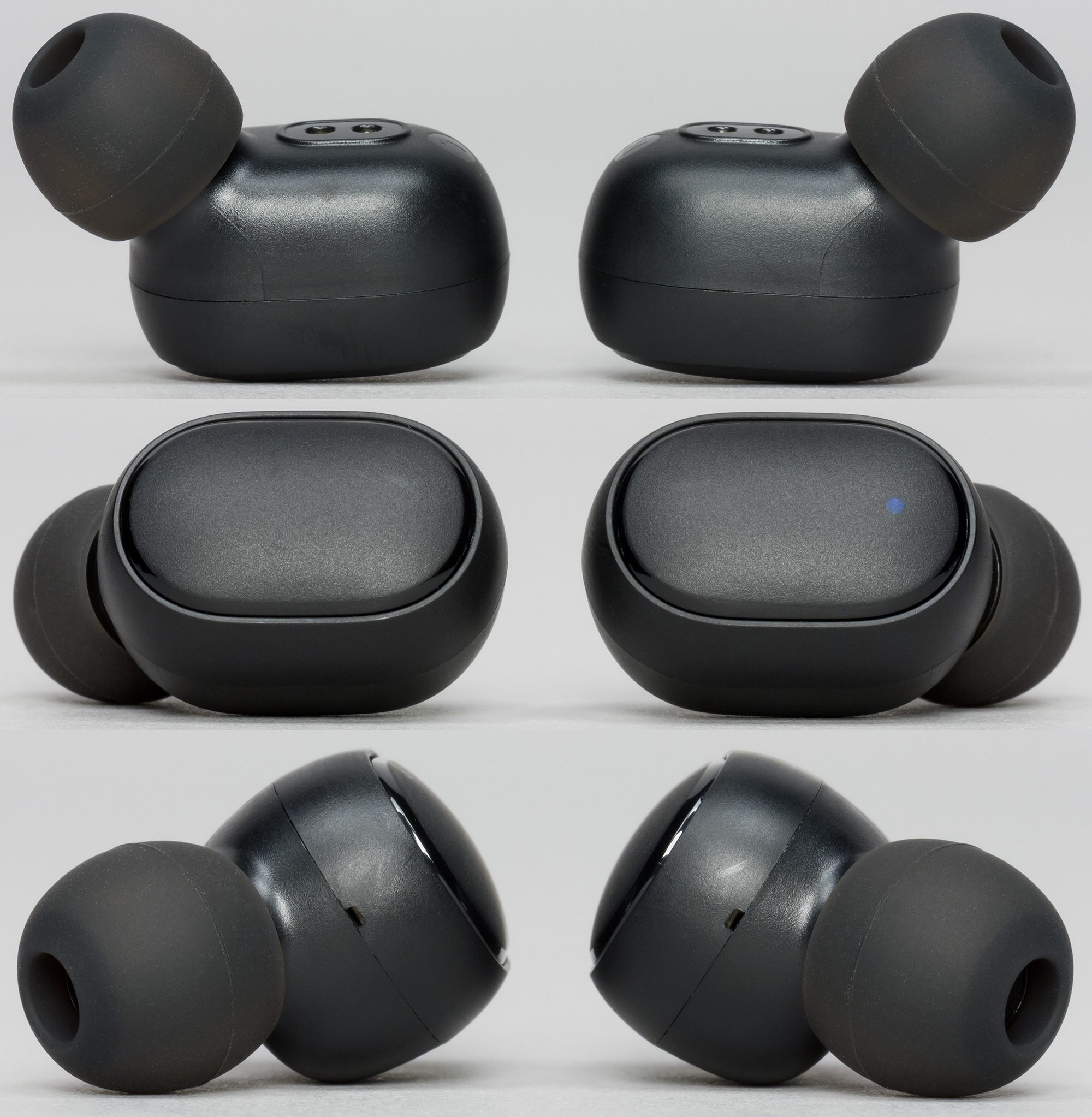 На передней панели расположены логотип и яркие светодиодные индикаторы, которые зачем-то мигают при работе наушников. Весьма спорное и непонятное решение — TWS-наушники и так смотрятся в ушах достаточно своеобразно, многие пользователи не хотят привлекать к ним лишнего внимания. К счастью, мигают они не так уж и часто — один раз в 7 секунд.