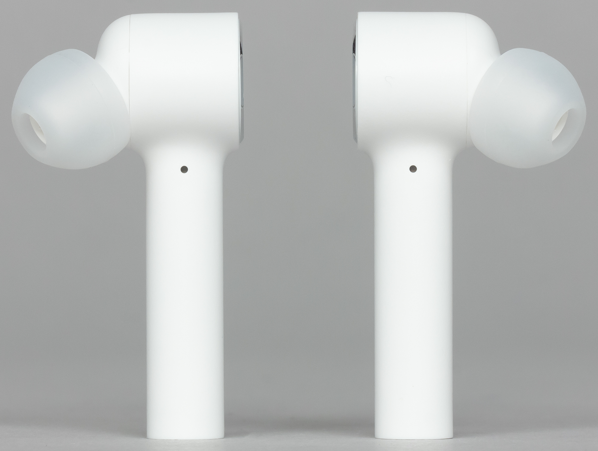 По дизайну Mi True Wireless напоминают AirPods. Но лишь напоминают — по факту они, как минимум, ощутимо крупнее. На корпусе можно заметить два отверстия микрофонов, служащих для разговоров и работы системы активного шумоподавления — одно рядом с динамиком, а другое — в основании «палочки».