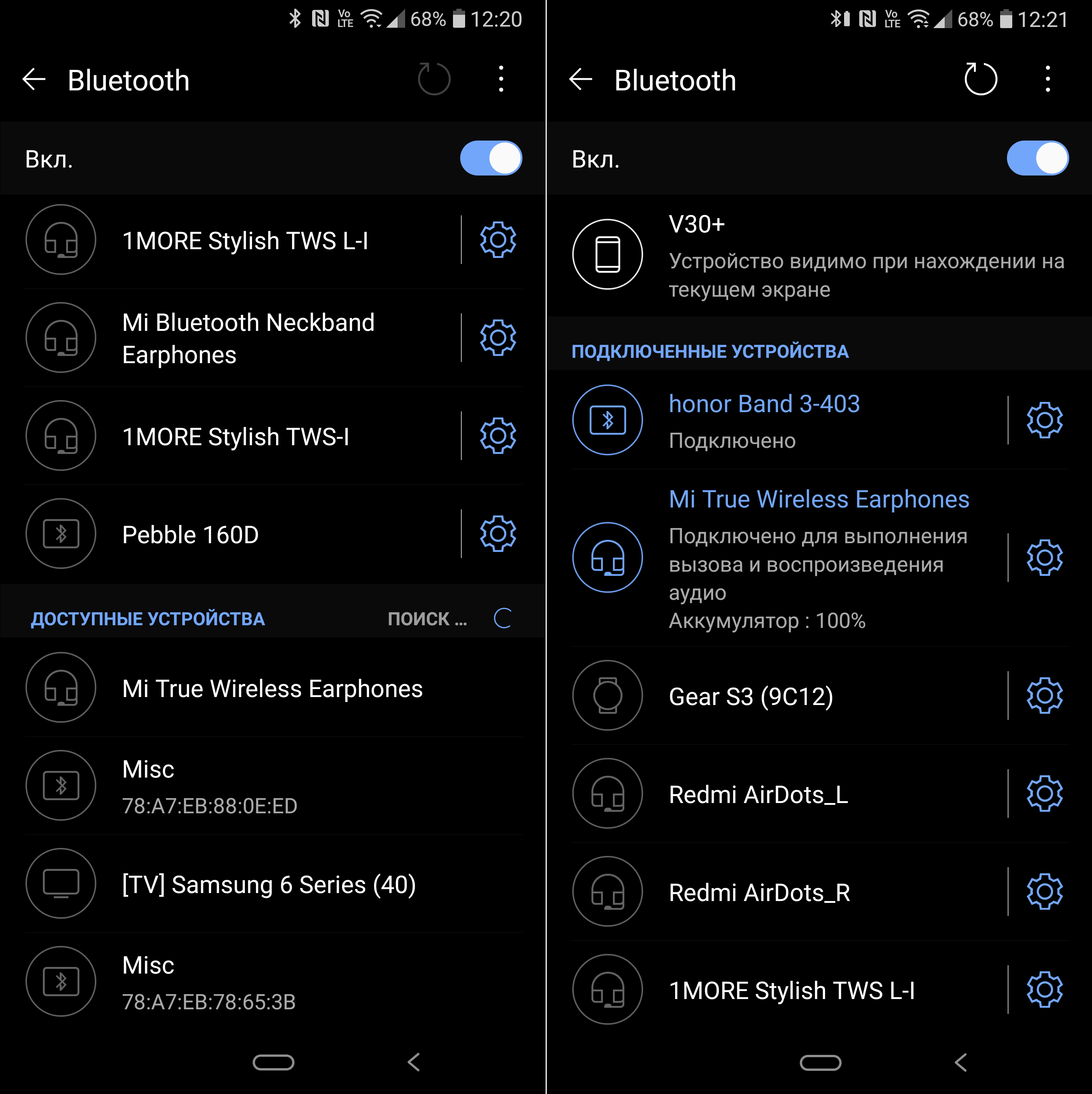 Начнем с Redmi AirDots. Оба наушника телефон «видит» отдельно — наверное, по замыслу создателей это должно обеспечивать больший комфорт использования, но на практике часто оборачивается лишними сложностями. Для использования обоих наушников в стереорежиме нужно подключиться к правому, левый «подхватится» автоматом. Если после этого убрать левый в кейс, то останется звучать один правый.