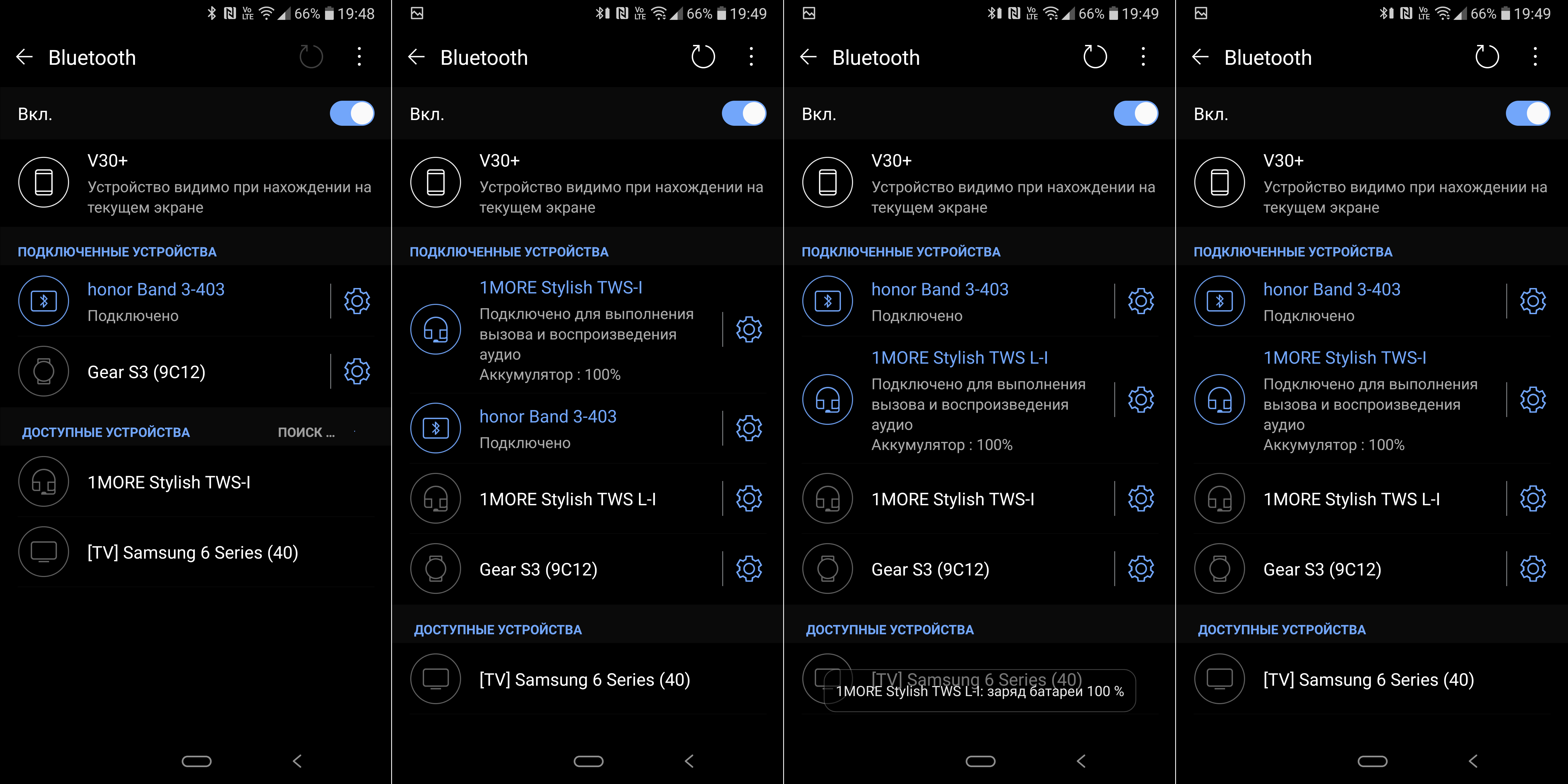 Уровень заряда всех трех тестируемых наушников можно отслеживать на экране гаджета — информация вполне корректно передается. При помещении в кейс наушники автоматически отключаются. Сигналом для этого, как и у множества других TWS-гарнитур, служит начало зарядки. Соответственно, если аккумулятор кейса разряжен — отключения не произойдет.