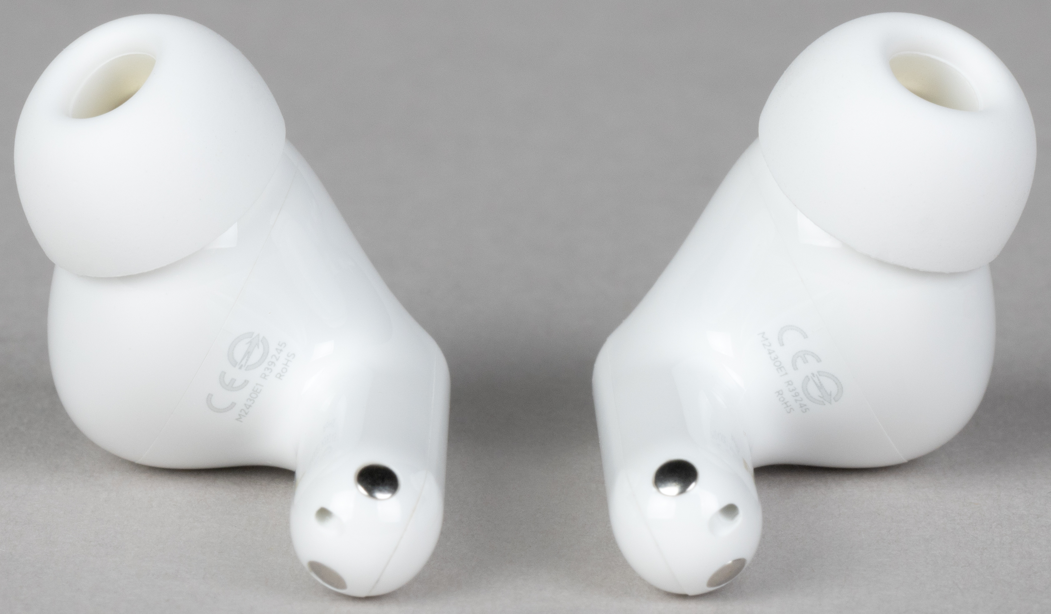 Звуковод имеет среднюю длину и выходит из основной части корпуса чуть под углом — он явно не рассчитан на глубокое проникновение в ушной проход, а значит, лишнего дискомфорта доставлять не будет, но и обеспечивать дополнительную фиксацию — тоже. «Палочки» не слишком длинные: 29 мм в целом, 16 мм — от основания округлой части. Цепляться за волосы, поднятые воротники и шарфы они не будут.