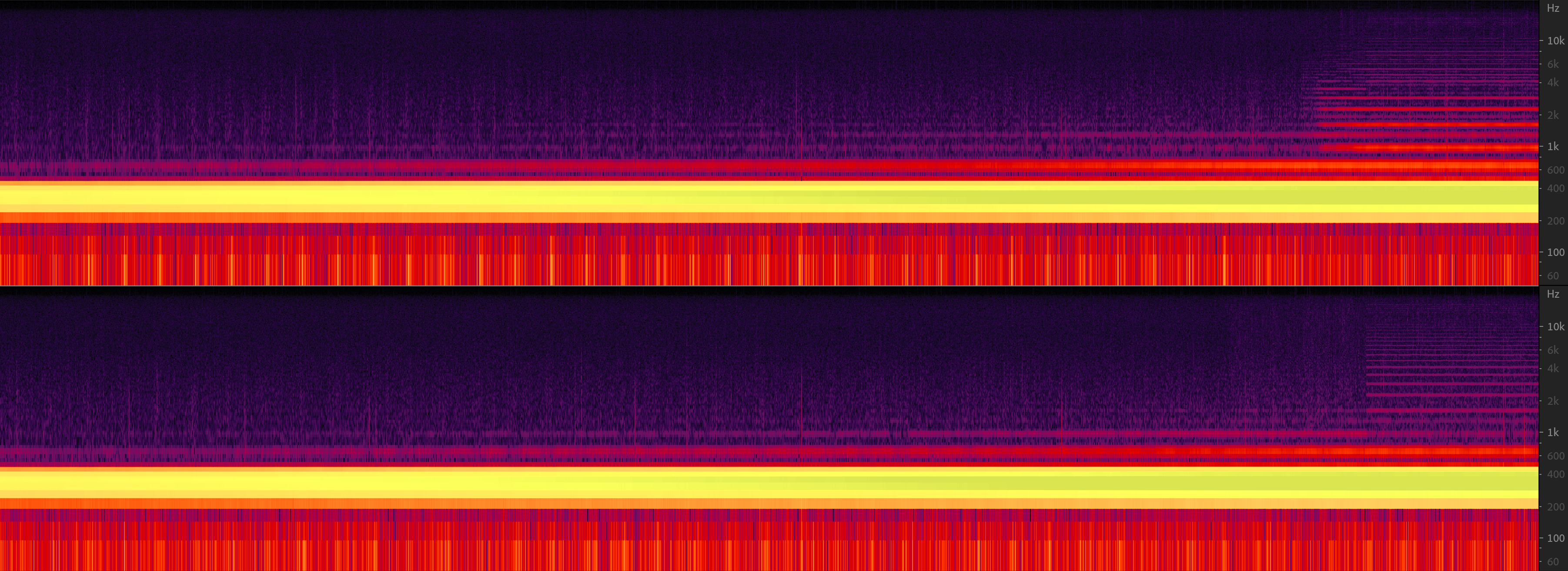 Посмотрим, насколько эффективно работает антискейтинг с помощью специальной «тестовой пластинки». Ее авторы предлагают использовать для этого растущий по амплитуде сигнал частотой 315 Гц. В идеале он должен воспроизводиться без искажений в обоих каналах на протяжении всего времени звучания. Для начала запишем сигнал без антискейтинга и посмотрим на его спектрограмму. Видно, что искажения есть в обоих каналах. При этом появляются они уже на малой громкости.