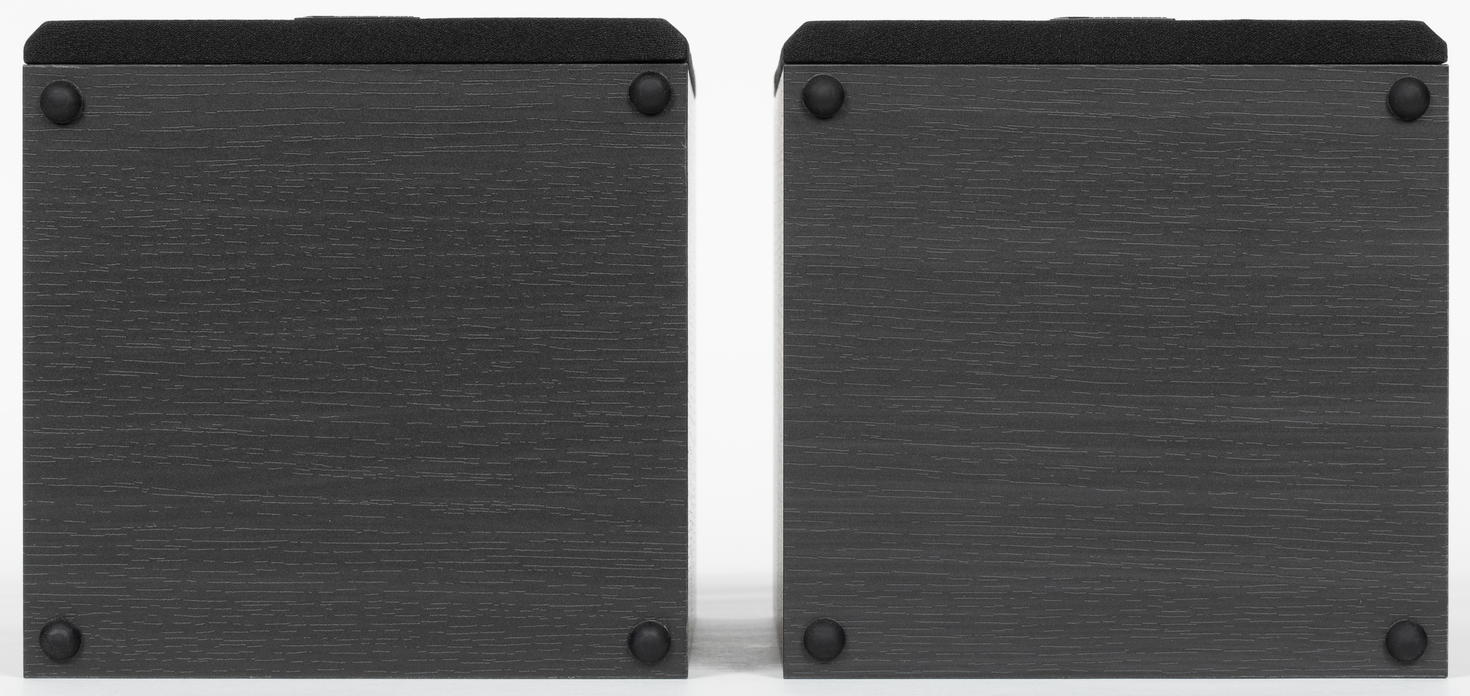 Колонки оформлены в том же стиле, что и проигрыватель — просто и строго, без лишнего декора. В нижней части обтянутых тканью грилей расположены небольшие серебристые логотипы бренда.