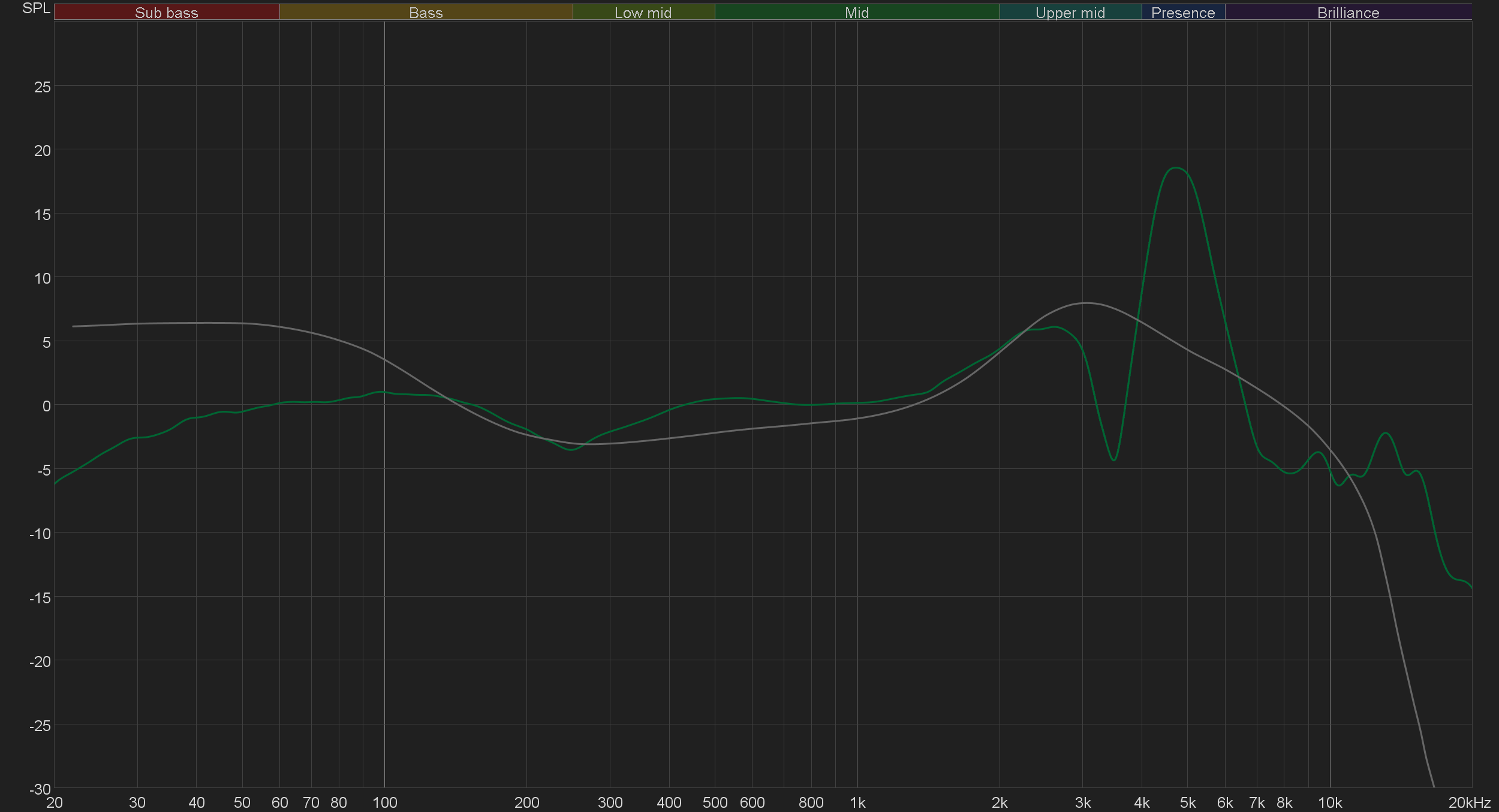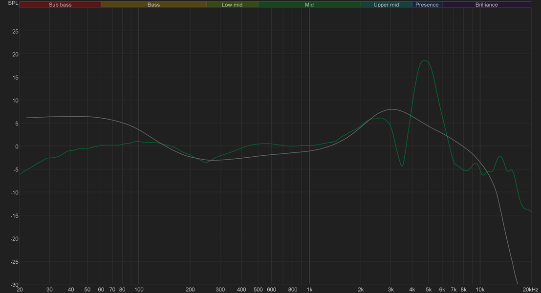 В целом, Roland RH-5 — отличный способ проверить, понравится ли вам тот самый «ровный звук», о котором так много говорится. И вполне вероятно, что не понравится. Просто в качестве иллюстрации покажем график АЧХ тестируемой модели на фоне целевой АЧХ для полноразмерных наушников, созданной командой Harman International под руководством доктора Шона Олива. Близкое к ней звучание оценивалось сотнями участников экспериментов как нейтральное, сбалансированное, естественное и так далее. Различия с тестируемыми наушниками довольно очевидны.