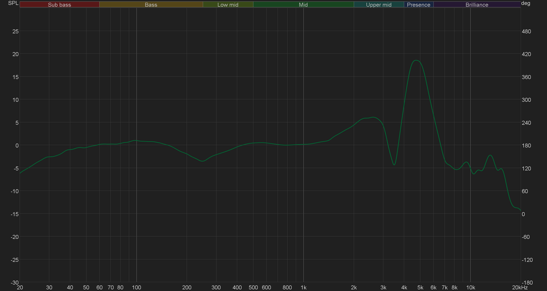 Главная особенность Roland RH-5 — довольно ровный график АЧХ, неравномерность в большей части диапазона не превышает 5 дБ. И никаких выраженных акцентов на басах, в отличие от подавляющего большинства современных моделей. В результате многим пользователям бас может показаться недостаточно ярко выраженным. А вот тем, кто любит акцентированную верхнюю середину и подчеркнутый вокал, звучание наверняка придется по душе.