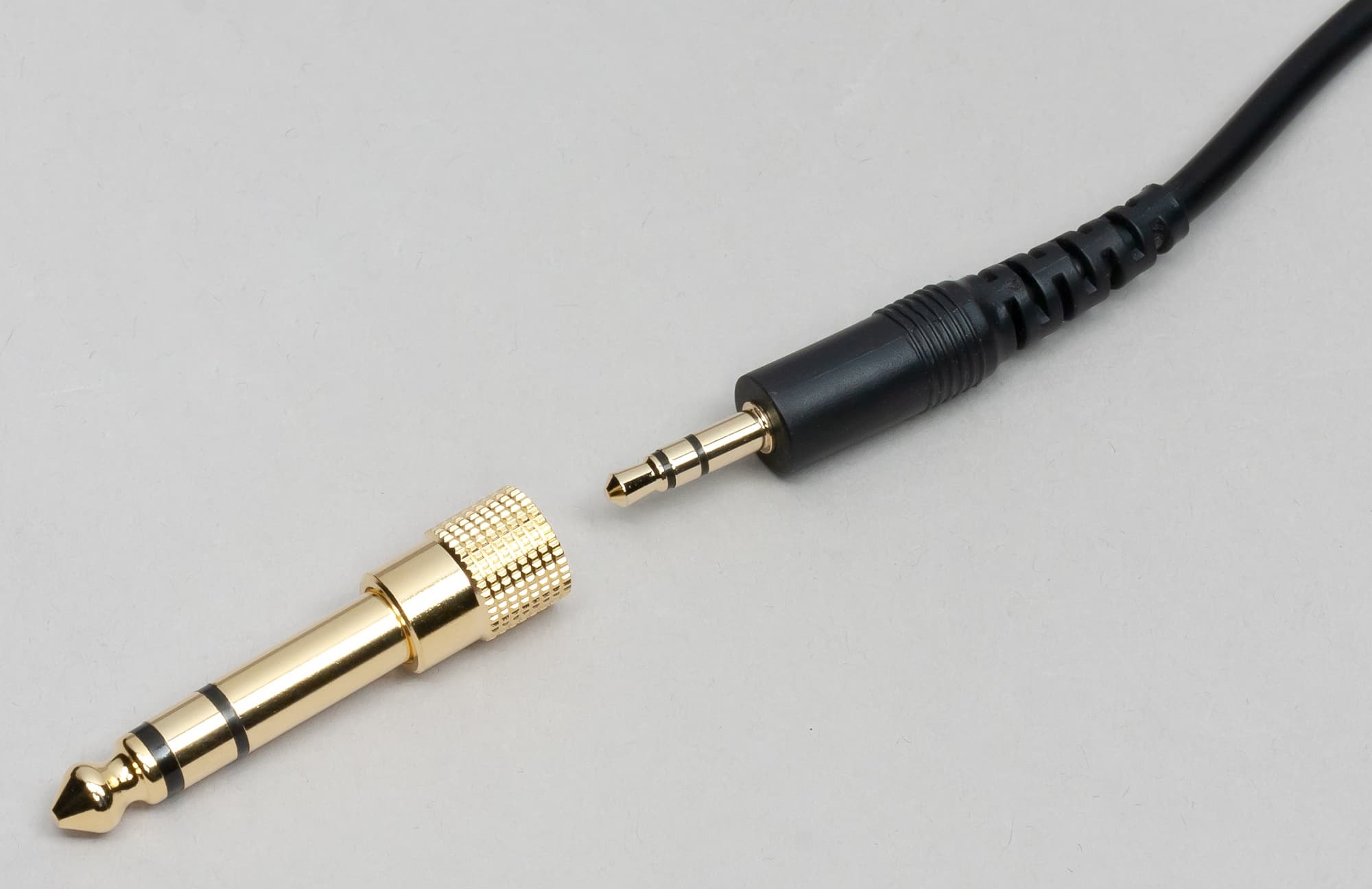 Трехметровый кабель имеет вполне достойный для бюджетного устройства уровень качества, для подключения к источнику используется позолоченный миниджек 3,5 мм. Переходник на «большой джек» 6,35 мм подключается с небольшим усилием и надежно удерживается на месте — не люфтит и обеспечивает надежный контакт.