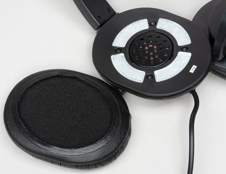 Снимаются амбушюры довольно легко, при необходимости им можно будет заменить на совместимые. Динамик небольшой — всего 40 мм, сверху защищен металлической накладкой с отверстиями.