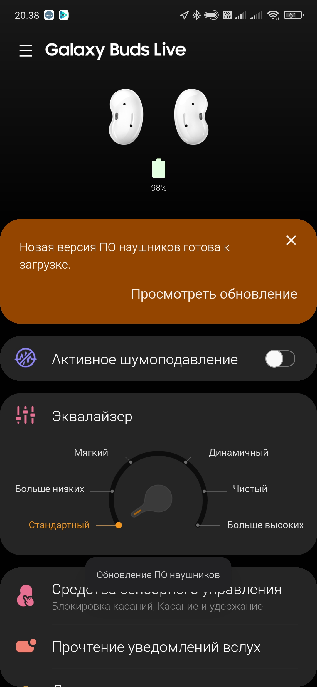 И вновь мы на главном экране. Там и дальше периодически будут появляться разного рода оповещения — о безопасности, обновлениях и так далее. Нас же сейчас больше интересуют элементы управления. Самый первый из них включает и выключает активное шумоподавление. Следующий похож на спидометр и переключает пресеты встроенного эквалайзера. К сожалению, полноценного эквалайзера в приложении нет — придется использовать встроенный в плеер. А о предлагаемых шести предустановках мы поговорим в главе, посвященной звучанию гарнитуры.