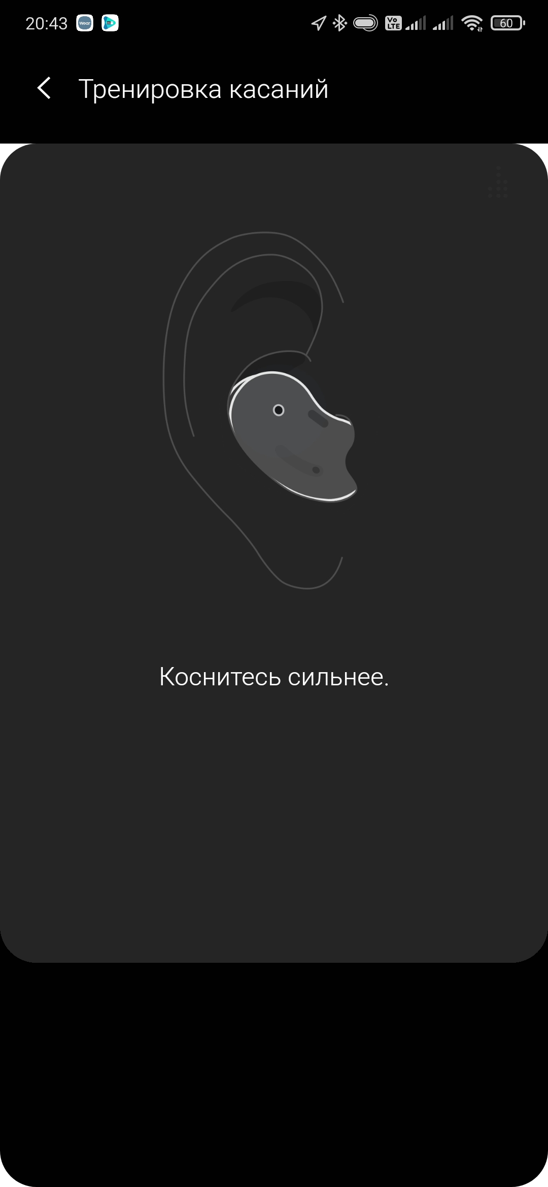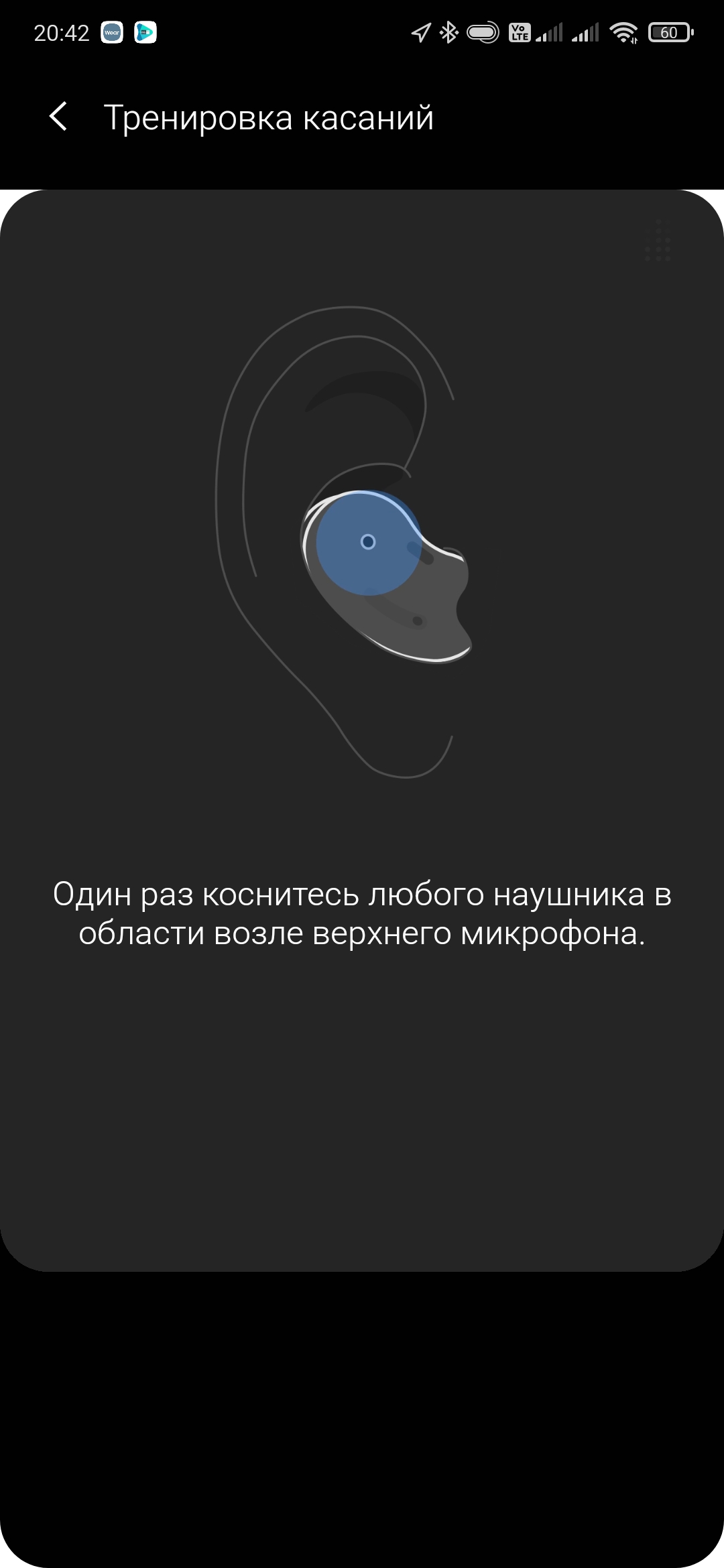 Далее расположены кнопки, открывающие страницы настроек. Разберем самые интересные. На первой можно отключить управление касанием, вновь запустить тренировку, о которой мы говорили выше, а также настроить реакцию на длительное касание, которое по умолчанию отвечает за включение шумоподавления. Функции остальных типов касаний типичны для большинства протестированных гарнитур: