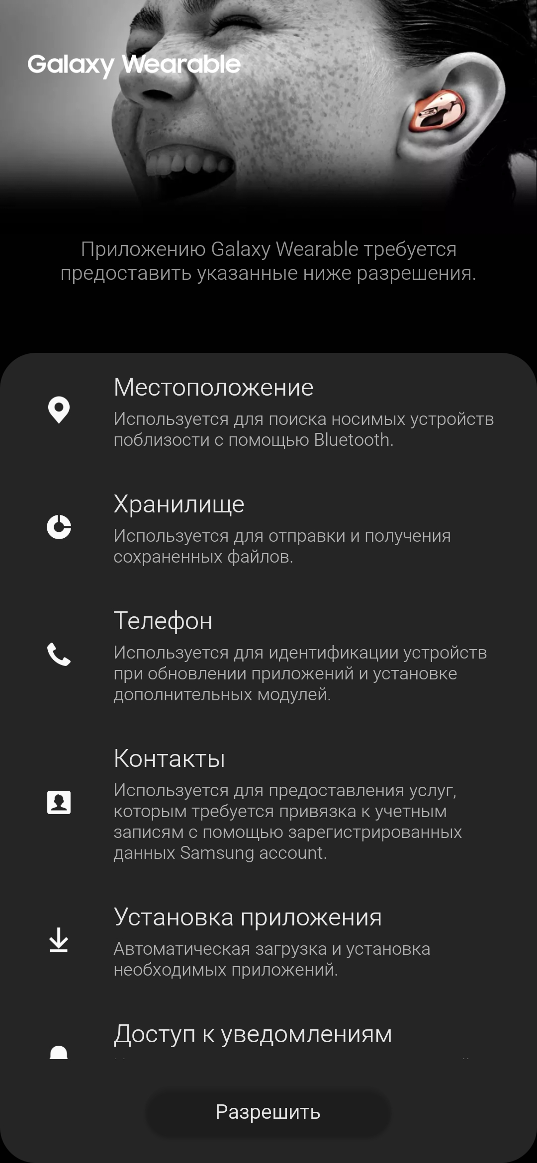 Настраивать гарнитуру можно с помощью уже упомянутого выше приложения Galaxy Wearable, служащего также для работы с другими носимыми устройствами производителя. Есть версии под Android и iOS, мы тестировали первый вариант. Установка происходит быстро и без проблем, программа запрашивает несколько разрешений, давать их или нет — дело пользователя. Но неоднократно подмечено, что без них Galaxy Wearable может работать не совсем корректно.
