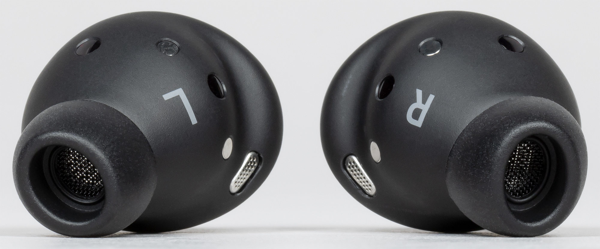 На обращенной к уху части корпуса видны обозначения правого и левого наушников, контакты для зарядки, отверстие внутреннего микрофона и окошко инфракрасного датчика ношения.