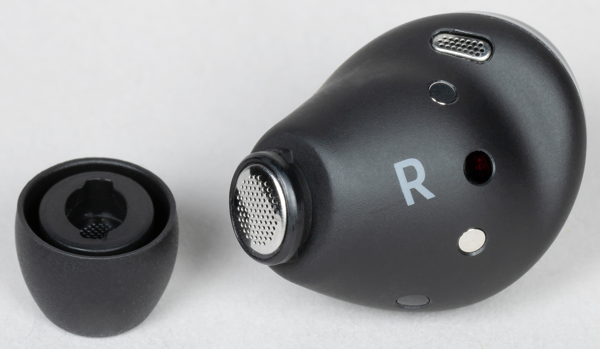 Отверстие внутреннего микрофона расположено в углублении, образуемом выступом на корпусе и его основанием. По всей видимости, это позволяет датчику плотно контактировать с нижней ножкой противозавитка ушной раковины и снимать все нужные вибрации. Однако столь плотный контакт оказывает свое влияние на комфорт посадки — об этом мы поговорим чуть ниже.
