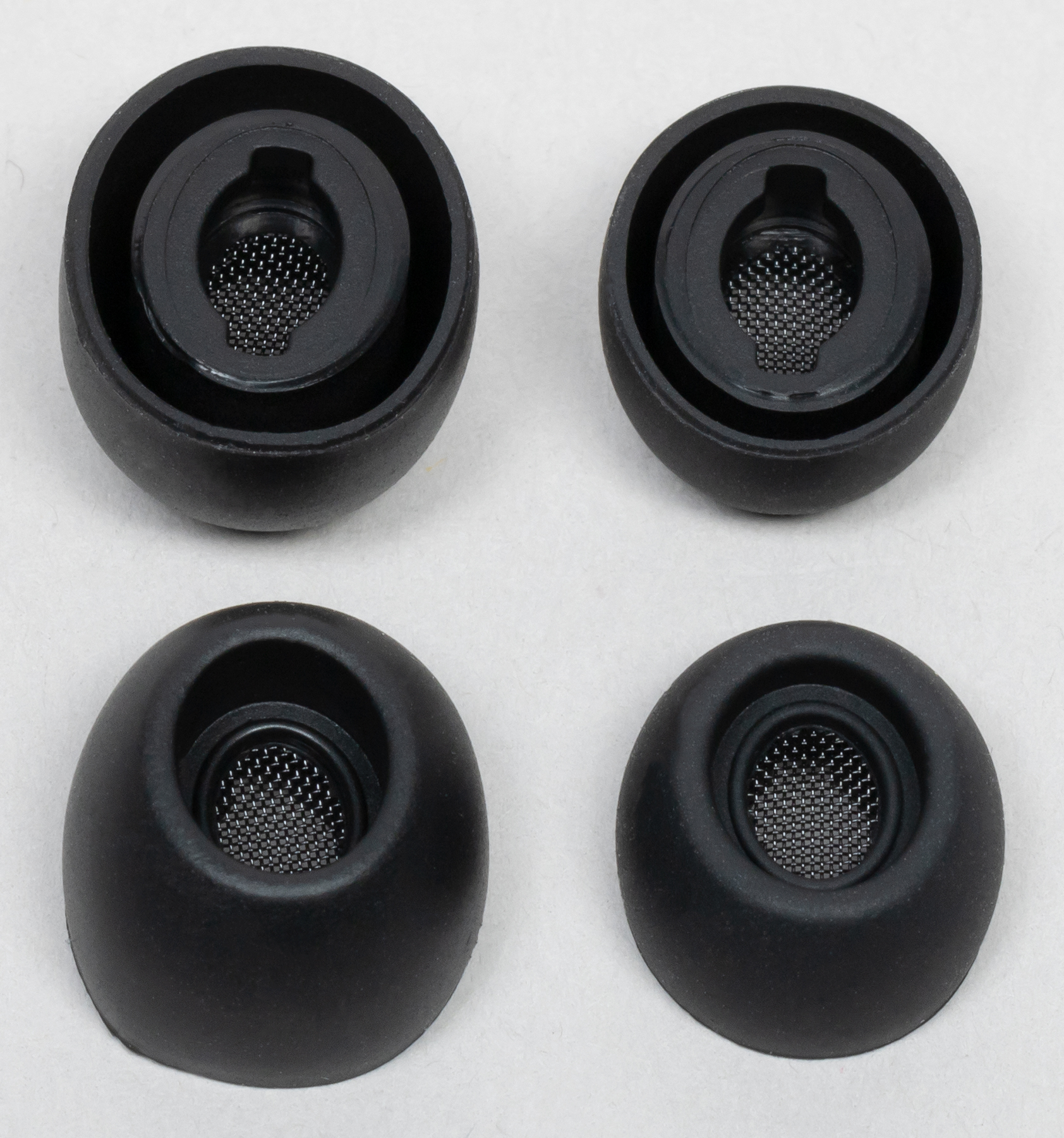 Амбушюры имеют весьма интересную конструкцию. Отверстие сделано овальным и защищено от проникновения загрязнений сеточкой. Крепление на звуковод осуществляется с помощью специального элемента в основании насадок, благодаря которому оно происходит с ощутимым щелчком. Все отлично работает, к качеству никаких претензий… Вот только сменить насадки в случае утери оригинальных будет тяжело — стандартные не подойдут.