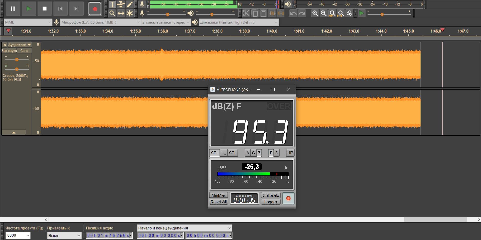 Безопасным уровнем звукового давления при прослушивании музыки в наушниках считается 75 дБ, но на практике большинство пользователей предпочитает уровень в районе 90-100 дБ. Мы транслируем в наушники белый шум, фиксируя уровень SPL в районе 95 дБ, сразу после старта воспроизведения запускаем запись сигнала с измерительного стенда — по длине получившегося трека легко понять, сколько проработал каждый из наушников.