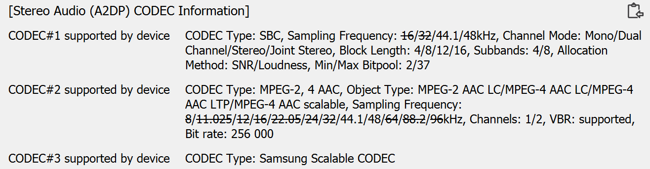 | Поддержка кодеков | SBC, AAC, Samsung Scalable |