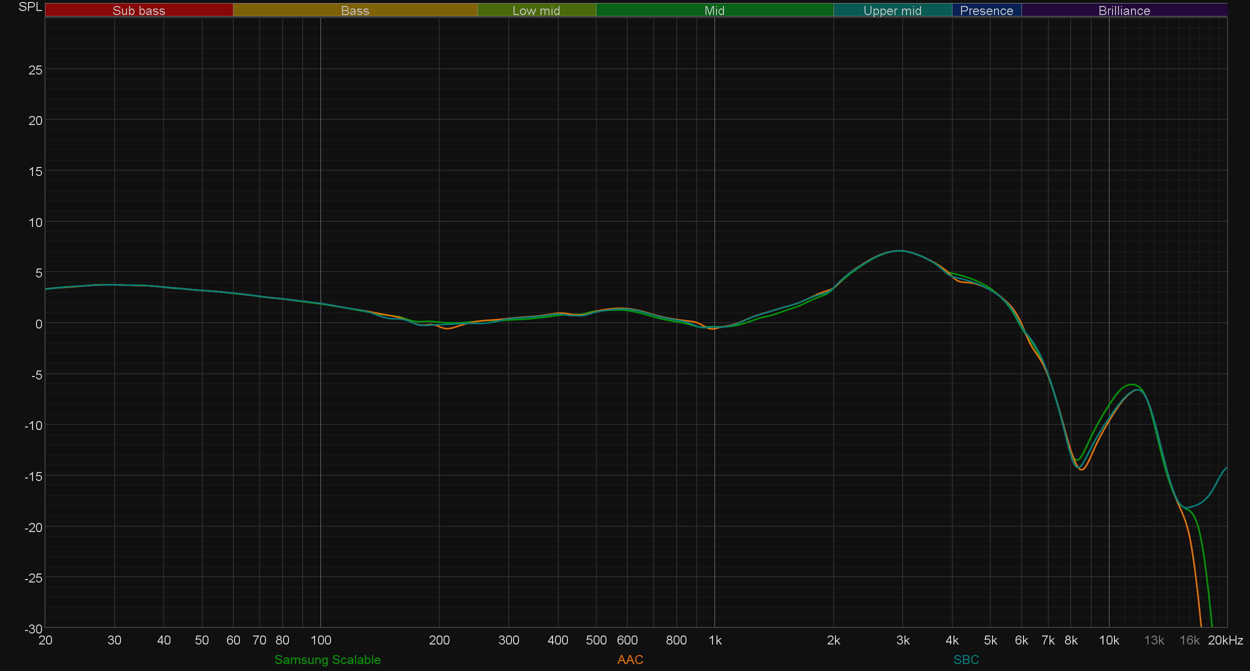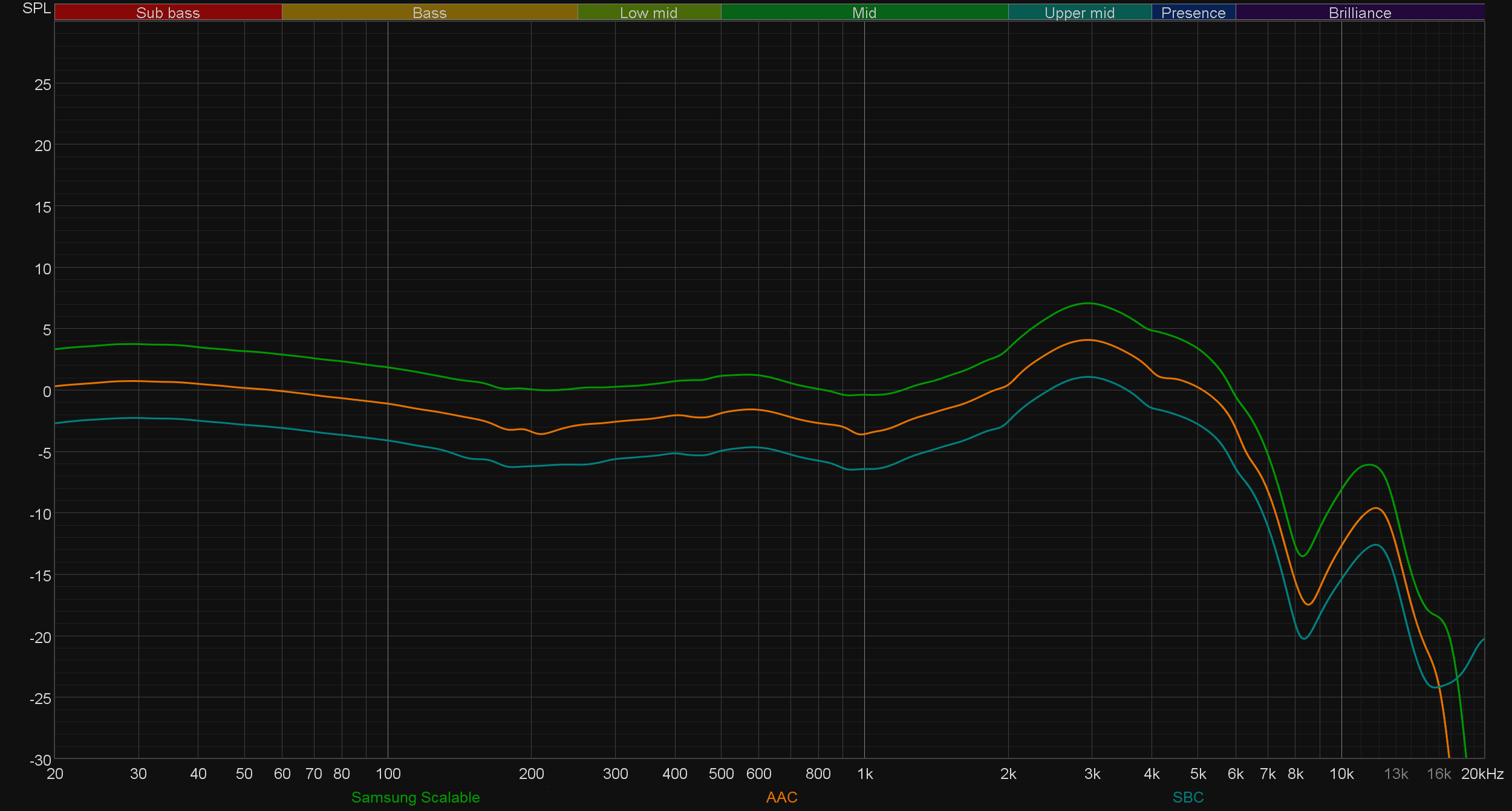 Выше мы обещали, что вернемся ненадолго к вопросу применения различных кодеков. Основная часть графиков получена с используемым по умолчанию Samsung Scalable, но ради интереса мы переключились и на поддерживаемые также SBC и AAC. Покажем все три графика вместе.
