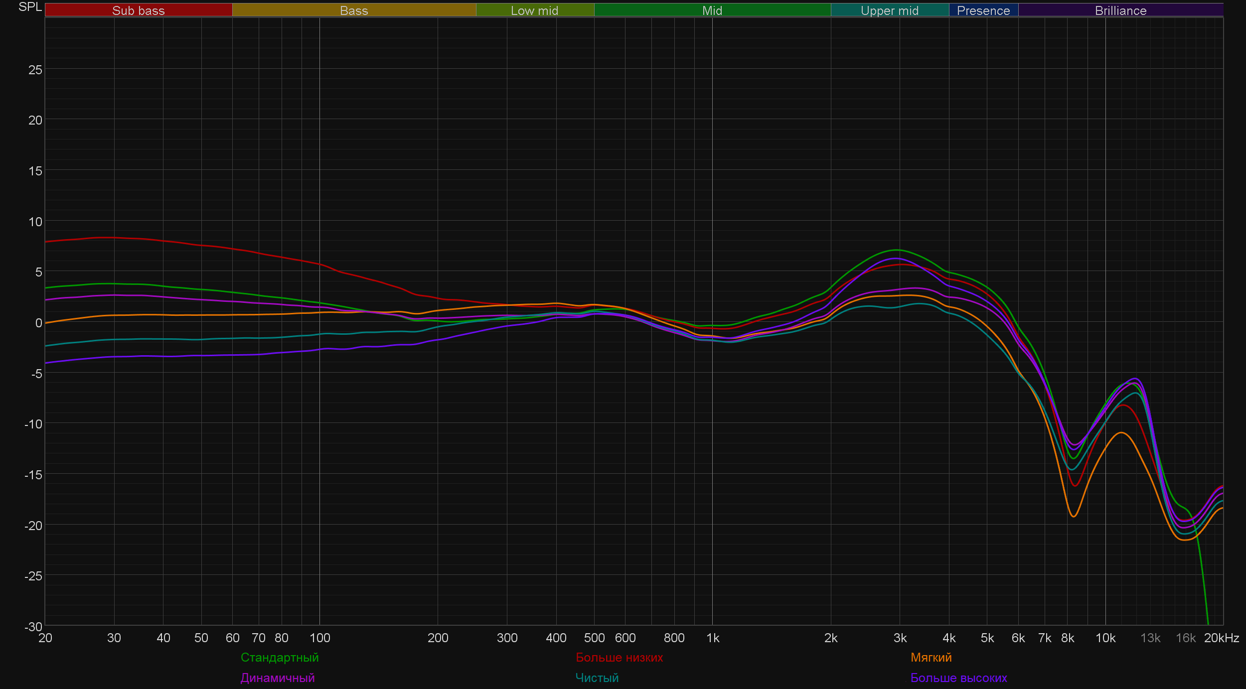 Вот так все выглядит еще более очевидно. Ну а мы будем двигаться дальше и посмотрим на работу пресетов эквалайзера. Как можно заметить, в основном они изменяют выраженность акцентов на басах и верхних частотах. Причем чаще всего затрагивают оба параметра: режим «Больше низких», к примеру, не только основательно форсирует акцент на басе, но и чуть уводит назад высокочастотный диапазон. Ну и так далее. На графиках ниже можно познакомиться с другими пресетами, отдельно хотелось бы отметить еще один — «Мягкий», который значительно сглаживает V-образность АЧХ, делая звучание несколько более ровным и сбалансированным.