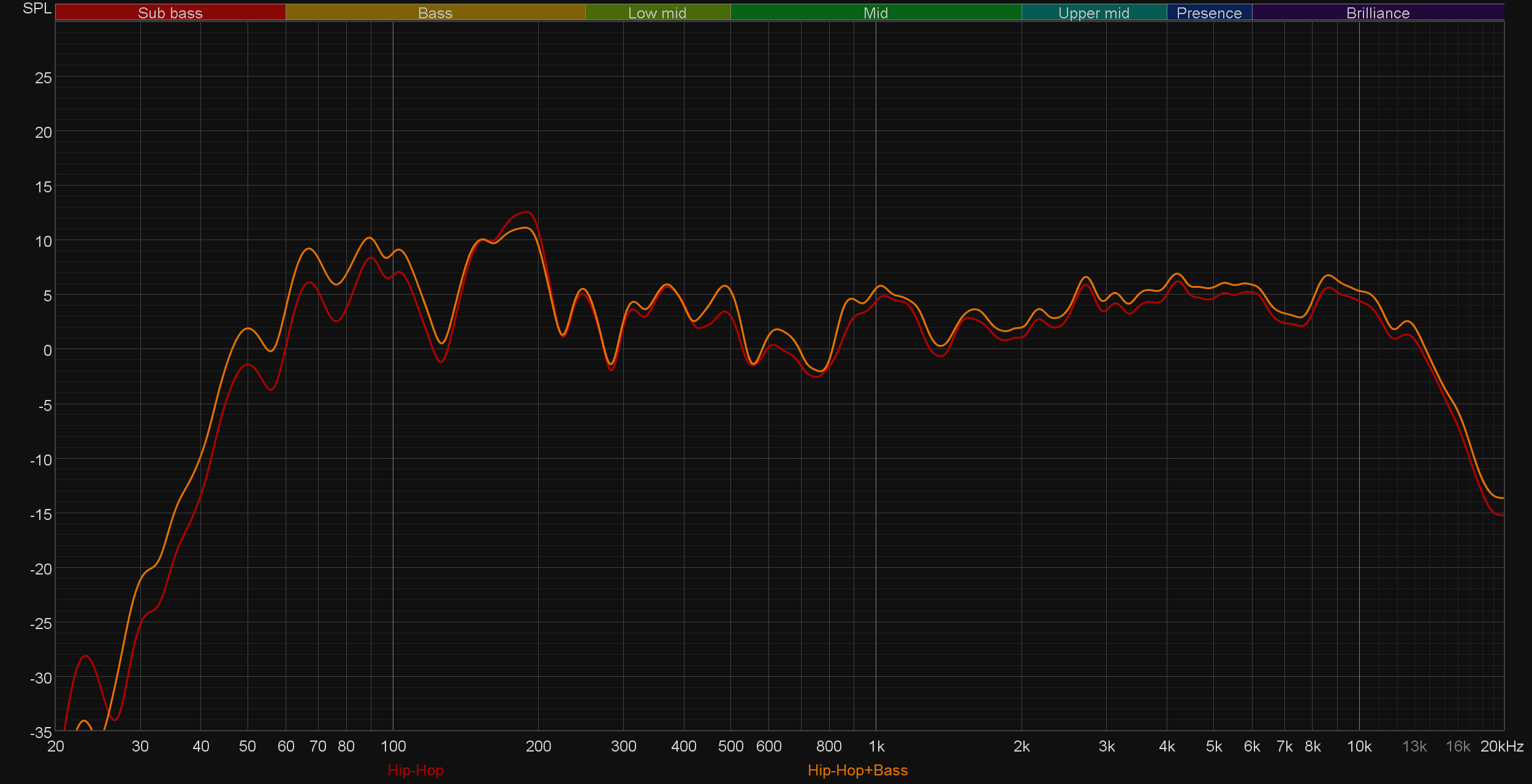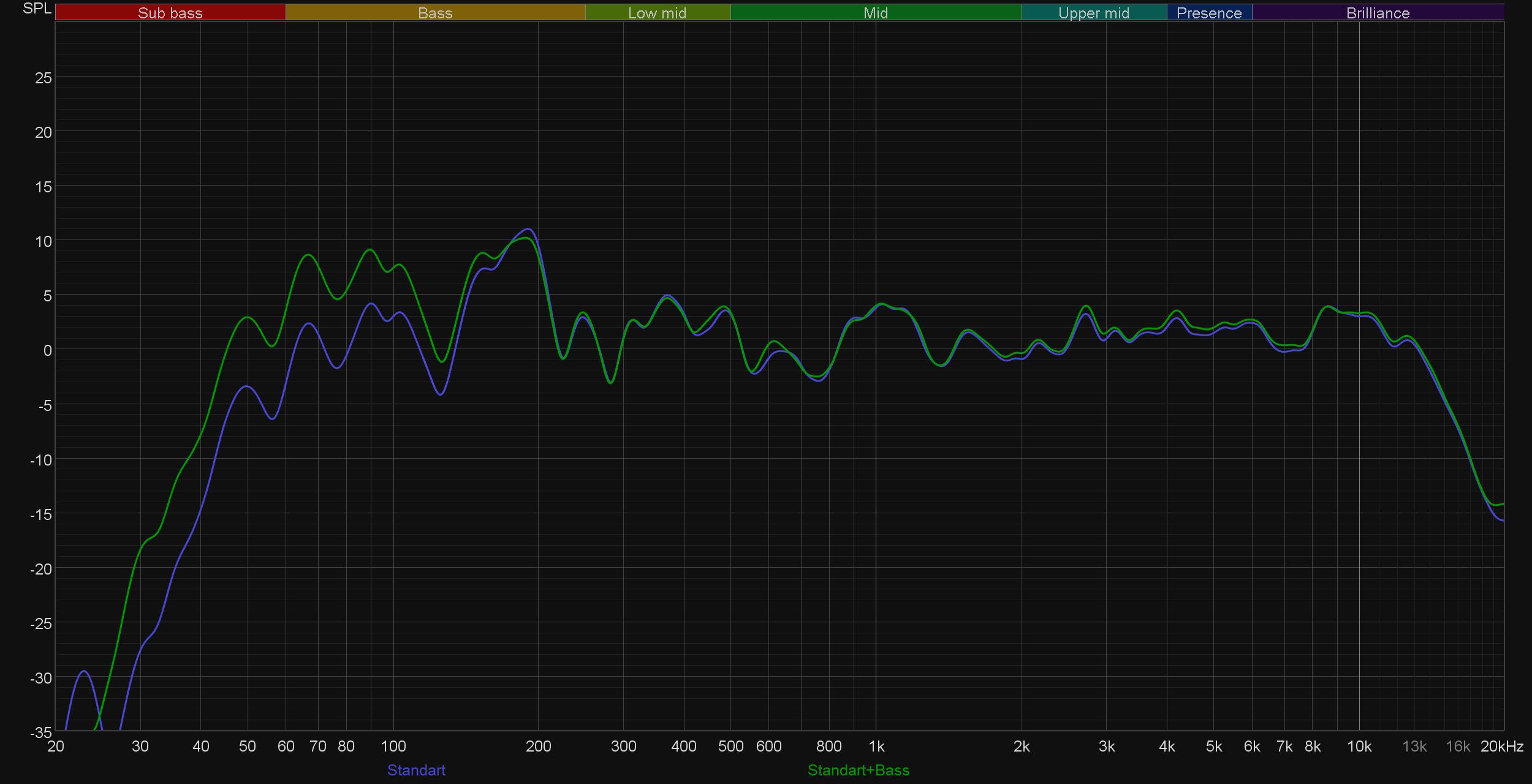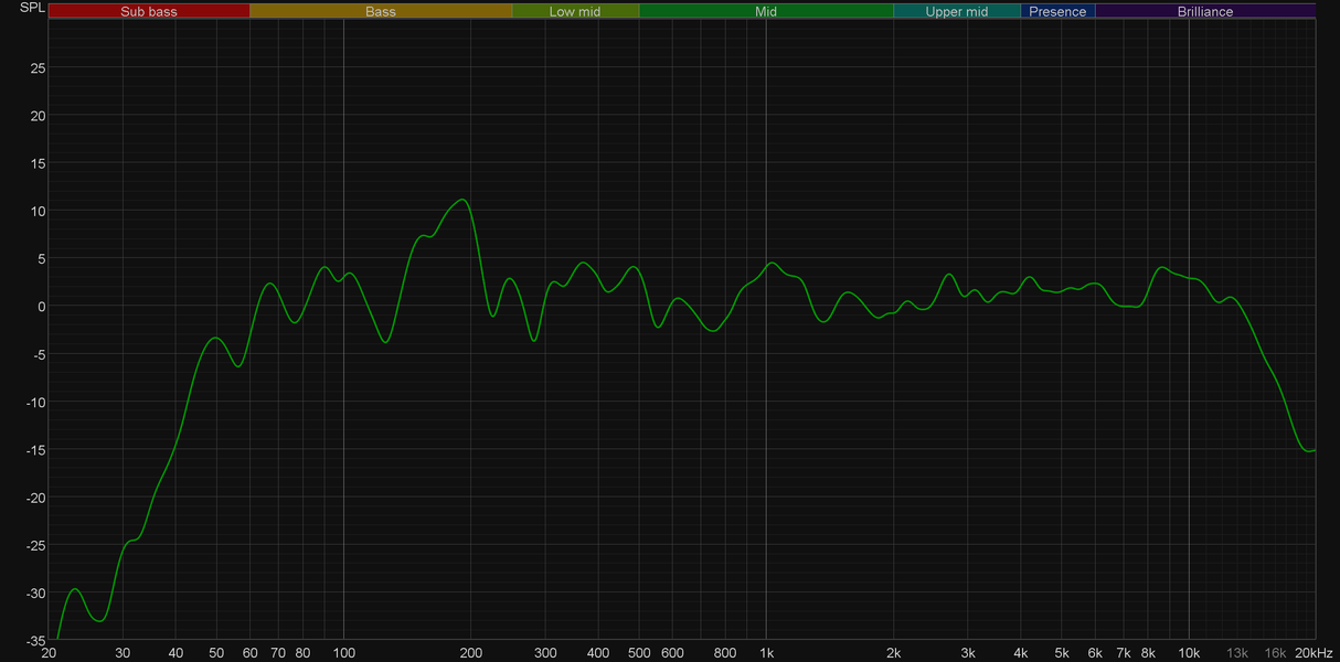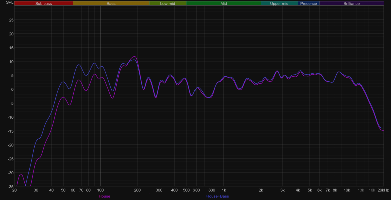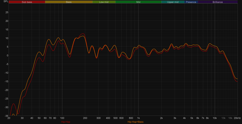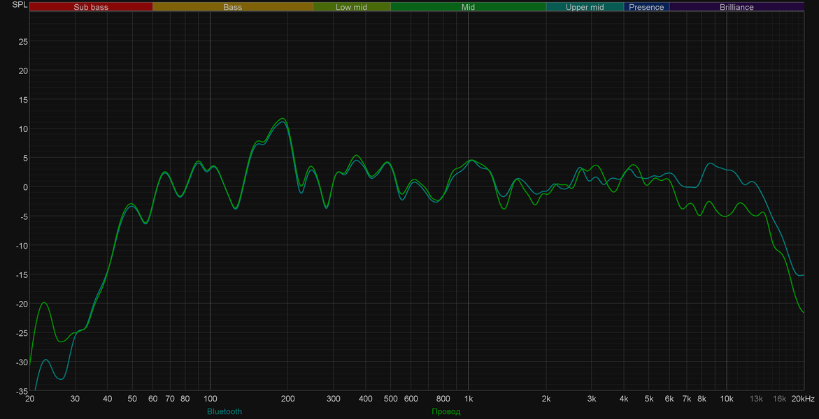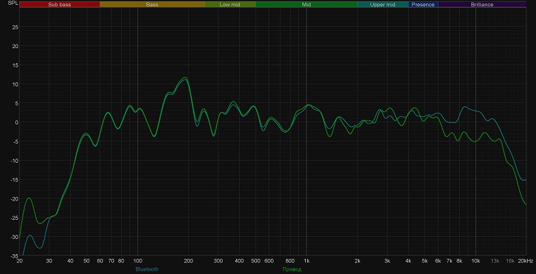 Сразу сравним звучание при проводном и беспроводном подключении. В целом ничего не меняется, если не считать небольшую «просадку» в передаче верхнечастотного диапазона. На слух различия не так очевидны, как на графике — руководствоваться при выборе типа подключения стоит исключительно соображениями удобства и комфорта использования.