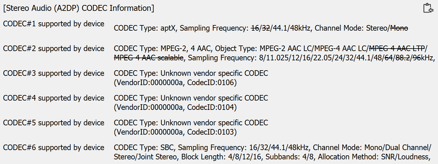 Поддержка мультипойнта есть, что было проверено параллельным подключением к Android-смартфону и ПК под управлением Windows 10. Работает все максимально корректно: при запуске воспроизведения на одном из устройств фокус автоматически переносится на него с минимальной задержкой. Заодно с помощью утилиты Bluetooth Tweaker был получен список поддерживаемых кодеков и их режимов.