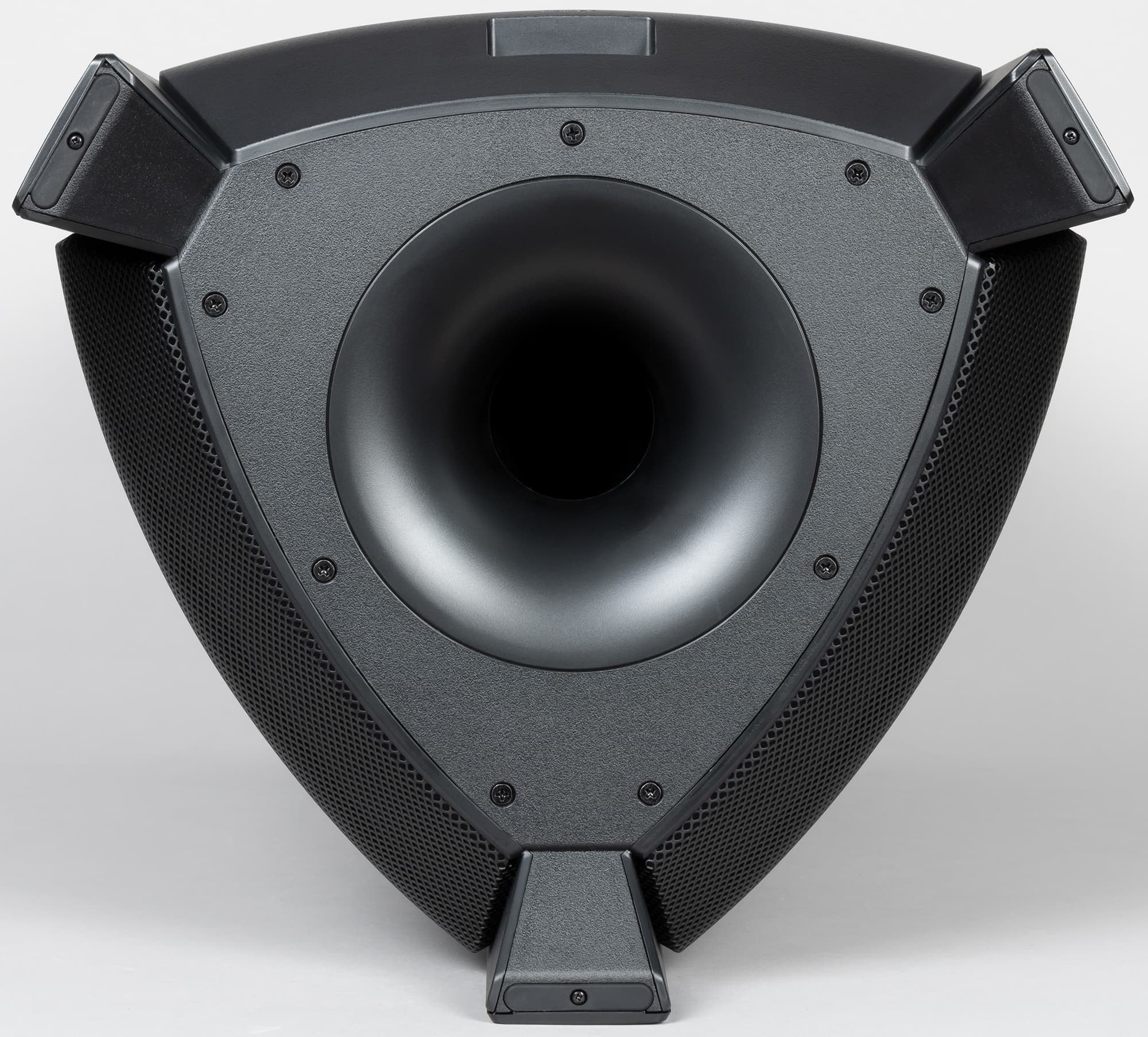 Размещены пары излучателей на двух расположенных под углом панелях, что обеспечивает более широкий охват пространства звуком.
